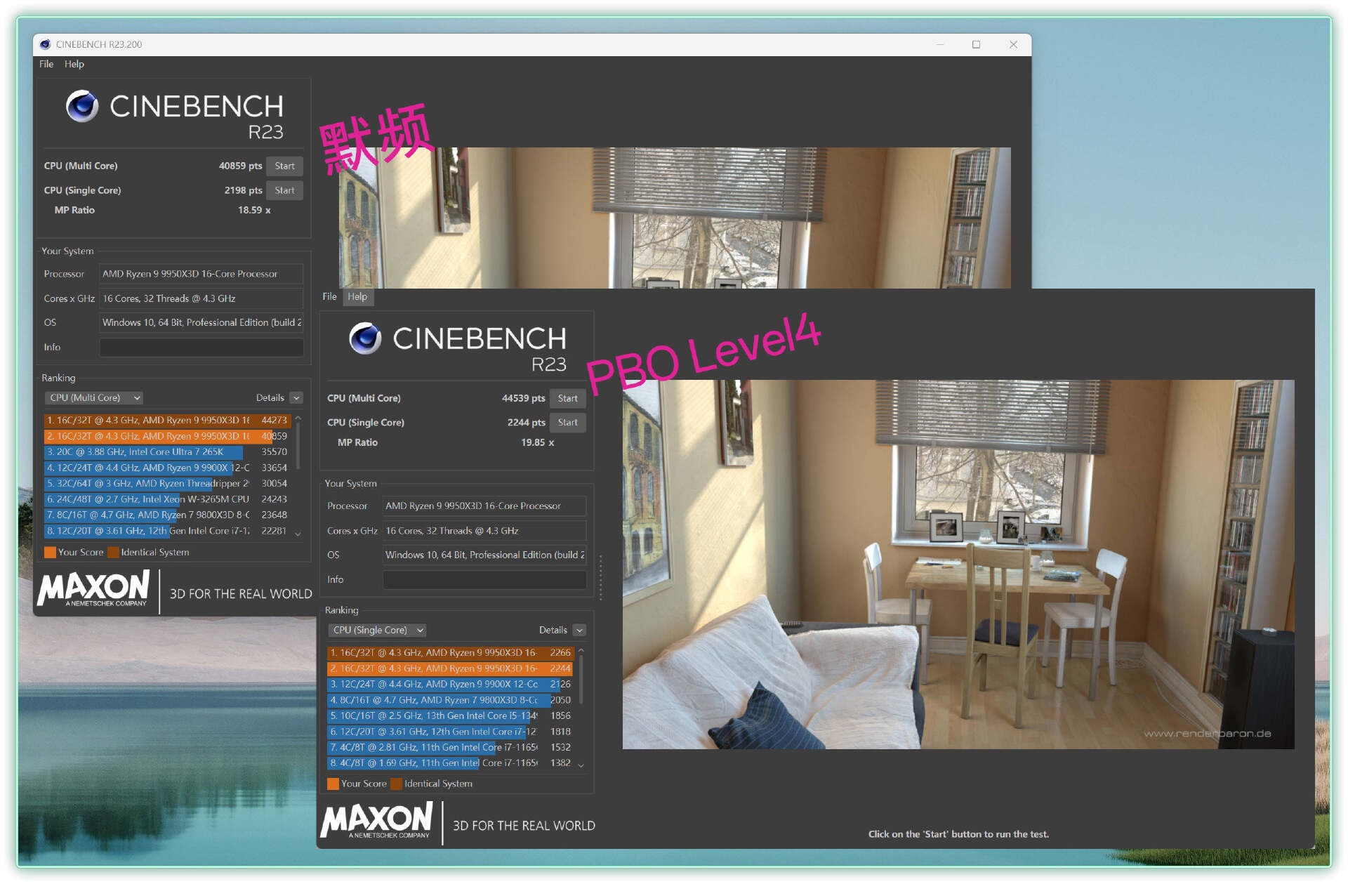 默频状态,9950X3D 交出了单核 857.8、多核 16859.7 的亮眼成绩。PBO Level4,单核飙到 873.3,多核更是冲上 17906.6。