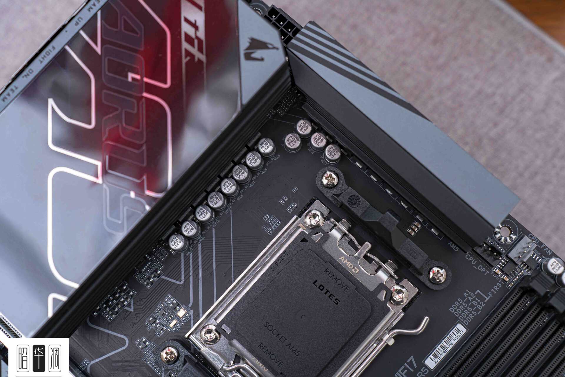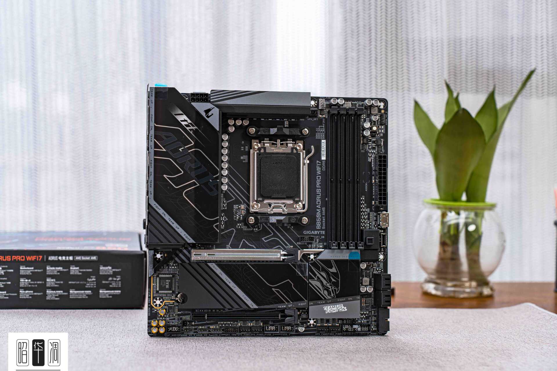 ▼视线转向主板,这块技嘉 B850M AORUS PRO WIFI7 的用料非常“堆”。首先映入眼帘的就是其极其夸张的 VRM 散热装甲,大面积的银灰色金属材质,质感和分量都相当到位。