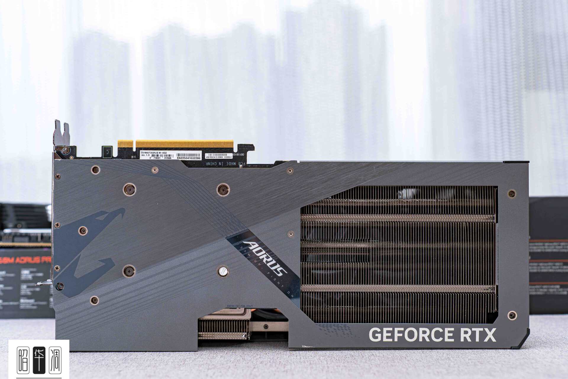 ▼显卡背面覆盖着一块厚实的银灰色金属背板,背板表面除了有熟悉的“大雕”AORUS LOGO,还大量运用拉丝、喷砂等涂装工艺提升整体质感。显卡右侧是超大面积的镂空设计,用于实现风道穿透,提升散热效率。