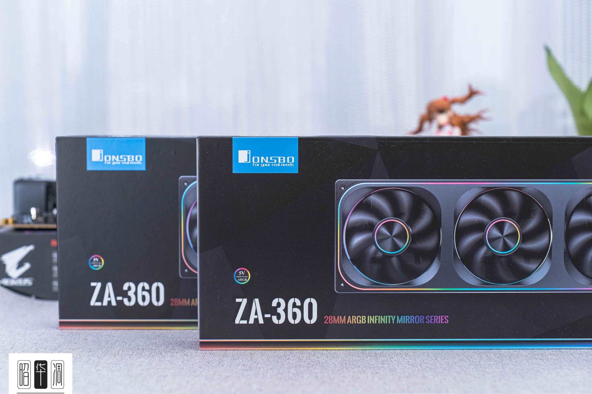 ▼ 机箱风扇我选择了两组乔思伯 ZA-360BR ARGB。这套风扇采用了连体设计,主打其 360° 四面的“千层镜”光效。除了我用的 360mm 版本,它还提供了 120mm 和 240mm 两种规格,并且涵盖了正叶和反叶的全系产品线。其中,240mm 和 360mm 版本均为“一线通”设计,极大简化了安装过程。