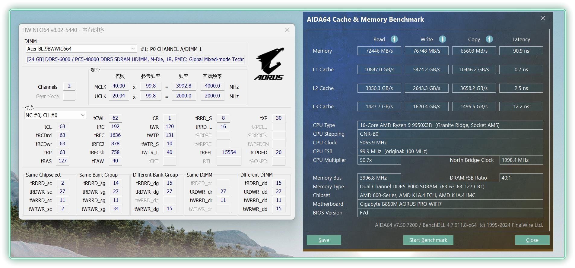 ▼技嘉的板子对内存优化特别到位,这里顺手跑了跑超频,进入 BIOS 手动将内存拉到 8000MT/s ,直接点亮并跑完测试,虽然此时的效能表现差强人意,但也侧面反映了主板和内存都具有相当大超频潜力。