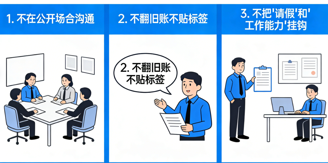 不翻旧账、不贴标签:沟通的重点是“当下的频繁请假问题”,别翻出员工半年前、一年前的请假记录,也别随口说他“不负责任”“工作态度差”。这样只会让沟通偏离重点,引发员工的反感,最后不欢而散。