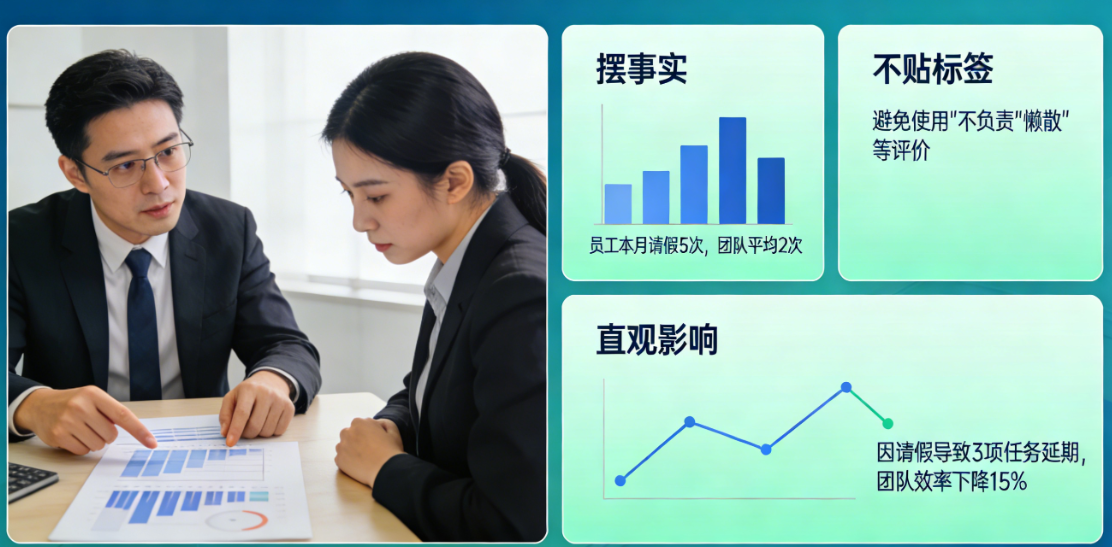 关心归关心,共情也不是无底线迁就。聊完员工的难处后,一定要客观地跟他说清楚,频繁请假对工作、对团队的实际影响——重点是“讲事实、不评判”,别给员工贴“不负责任”“工作态度差”的标签。