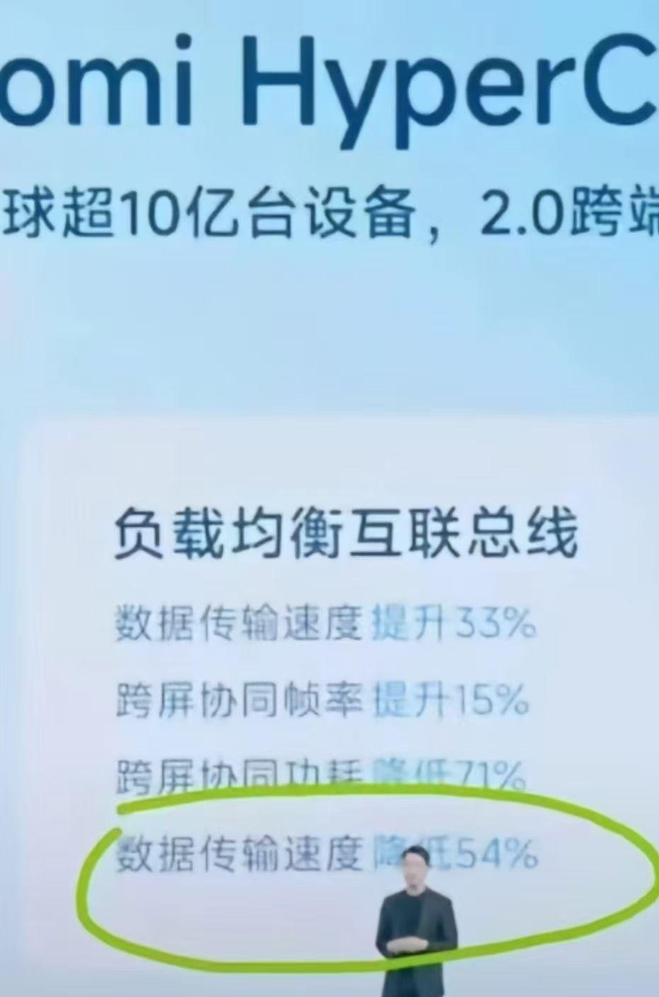 首先是金凡介绍澎湃OS2的时候,背景PPT显示数据传输速度降低54%,对于熟悉手机系统的人来说,这个数据明显的是负优化,大概率是PPT出现了漏字或者错字的现象。
