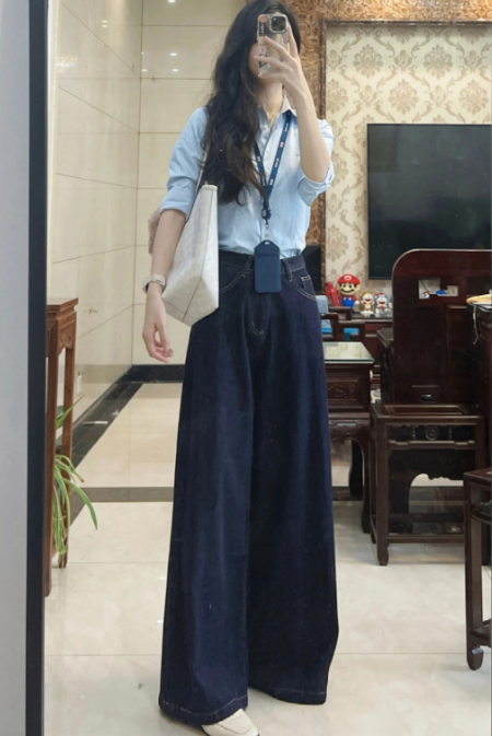 浅蓝色衬衫给人一种清新、沉稳的感觉,与深蓝色阔腿牛仔裤搭配,色彩和谐统一。衬衫可以选择稍微宽松一点的版型,营造出随性的氛围,同时也能在炎热的天气里带来更好的透气性。搭配一个黑色的手提包,整体造型简约又高级,适合在有商务洽谈或重要会议的日子穿着,展现出专业且优雅的气质。