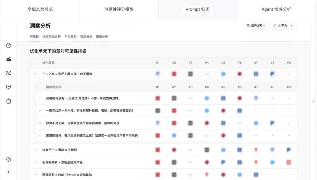 分析监控:设定完整的基准线,让企业选择定向范围以及目标地域、语言,然后去做、去触发我们的整个监控。触发监控后,我们可以直接让企业在5-10 分钟后迅速看到第一次数据反馈,产出原始回复明细和汇总数据。你就能看到AI平台当下是怎么反馈问题的、你在平台的位置如何(可见度、排名、平均位置、好感度、商品卡露出等等)。我们甚至支持企业客户自定义所需要的指标。