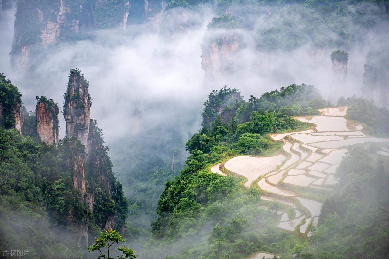 五、湖南张家界:阿凡达的奇幻世界张家界武陵源风景名胜区由张家界国家森林公园、索溪峪、天子山、杨家界四大部分组成。这里拥有3000多座石英砂岩峰林,直插云霄,是电影《阿凡达》的取景地,被称为“地球的纪念物”。