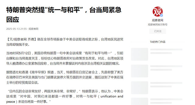 美国前总统特朗普,在谈到中美经贸磋商时,冷不防冒出一句关于“统一与和平”的说法。