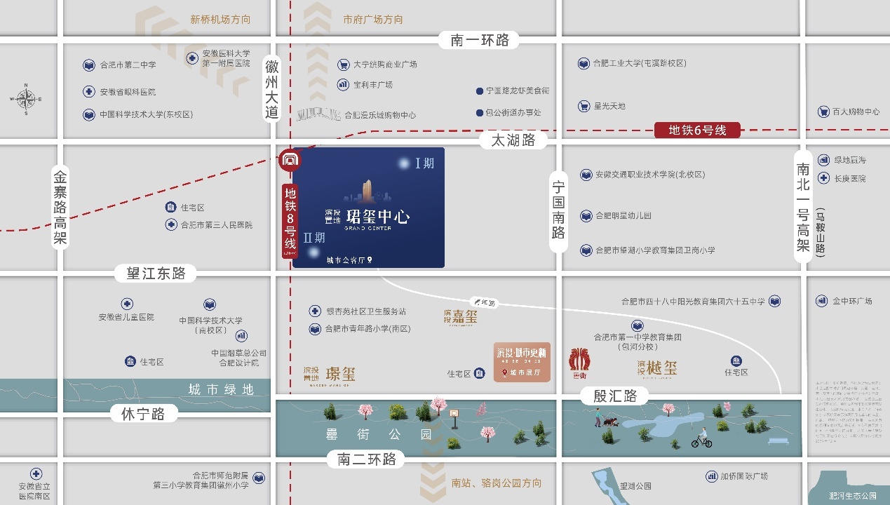 3、滨湖集团“卖旧买新”活动覆盖全合肥,珺玺中心一期的位置在包河区二环内的太湖路与徽州大道交口,周边主干道环绕、出门就到地铁6号线(开通)/8号线(规划)卫岗站地铁口,同样辐射全城;