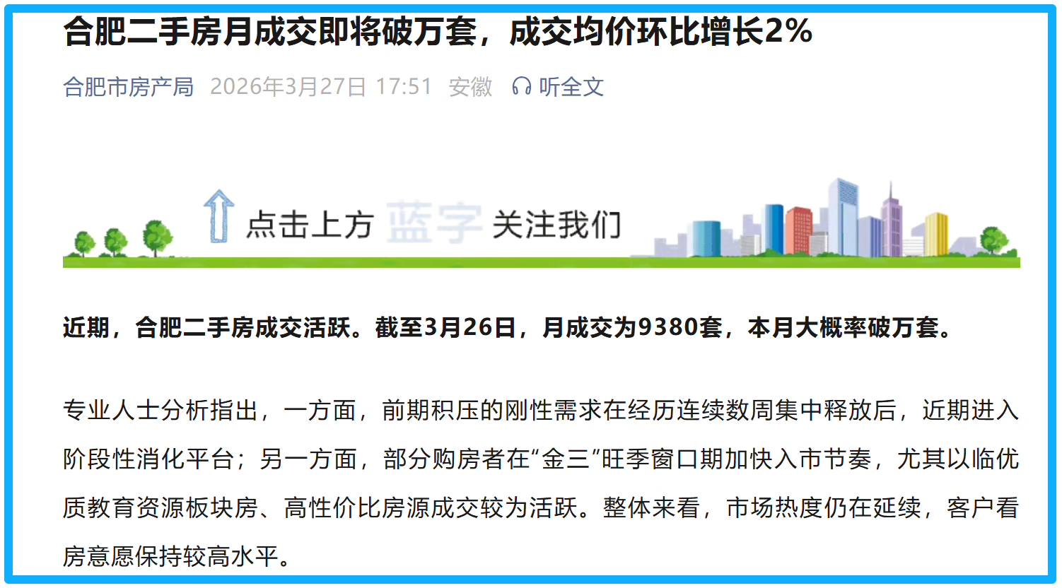 合肥市房产局3月27日以“合肥二手房月成交即将破万套,成交均价环比增长2%”为题发布文章,文内提到“合肥二手住宅调价房源中调涨占比为19.4%,较前一周提升2.1个百分点,业主调涨已连续三周上涨,反映业主对市场信心持续修复,预期逐步向好。”