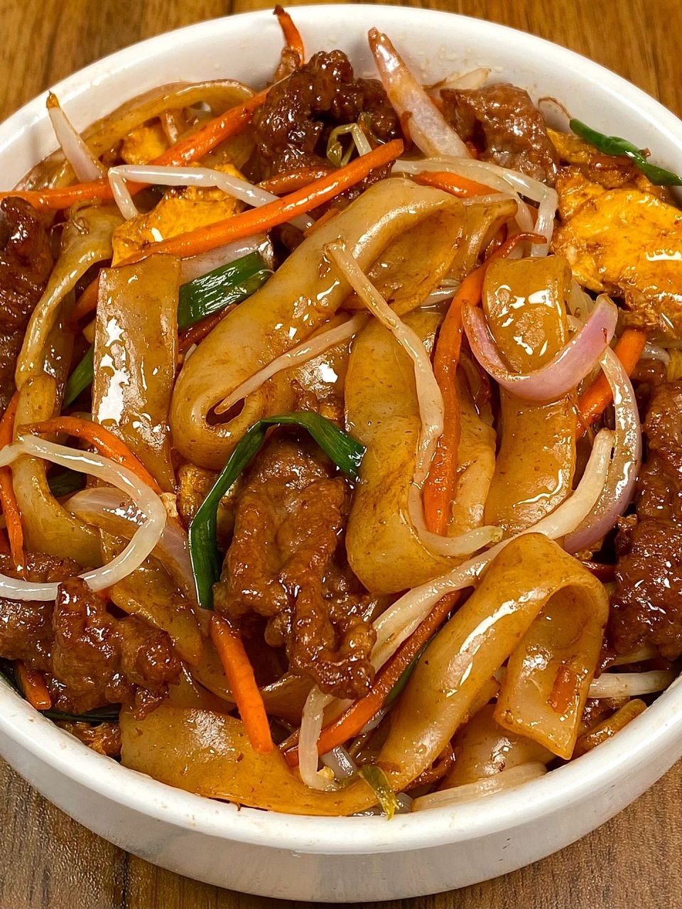 首先,咱们得说说这“牛河”是啥。牛,自然是鲜嫩多汁的牛肉条啦;河呢,其实是指的河粉,那滑溜溜、Q弹弹的口感,简直是米饭界的颜值与实力担当。而干炒,则是这门手艺的精髓所在,讲究的是火候与调料的完美融合,让每一根河粉、每一片牛肉都均匀裹上那层金黄诱人的酱汁,香气扑鼻,诱人至极!