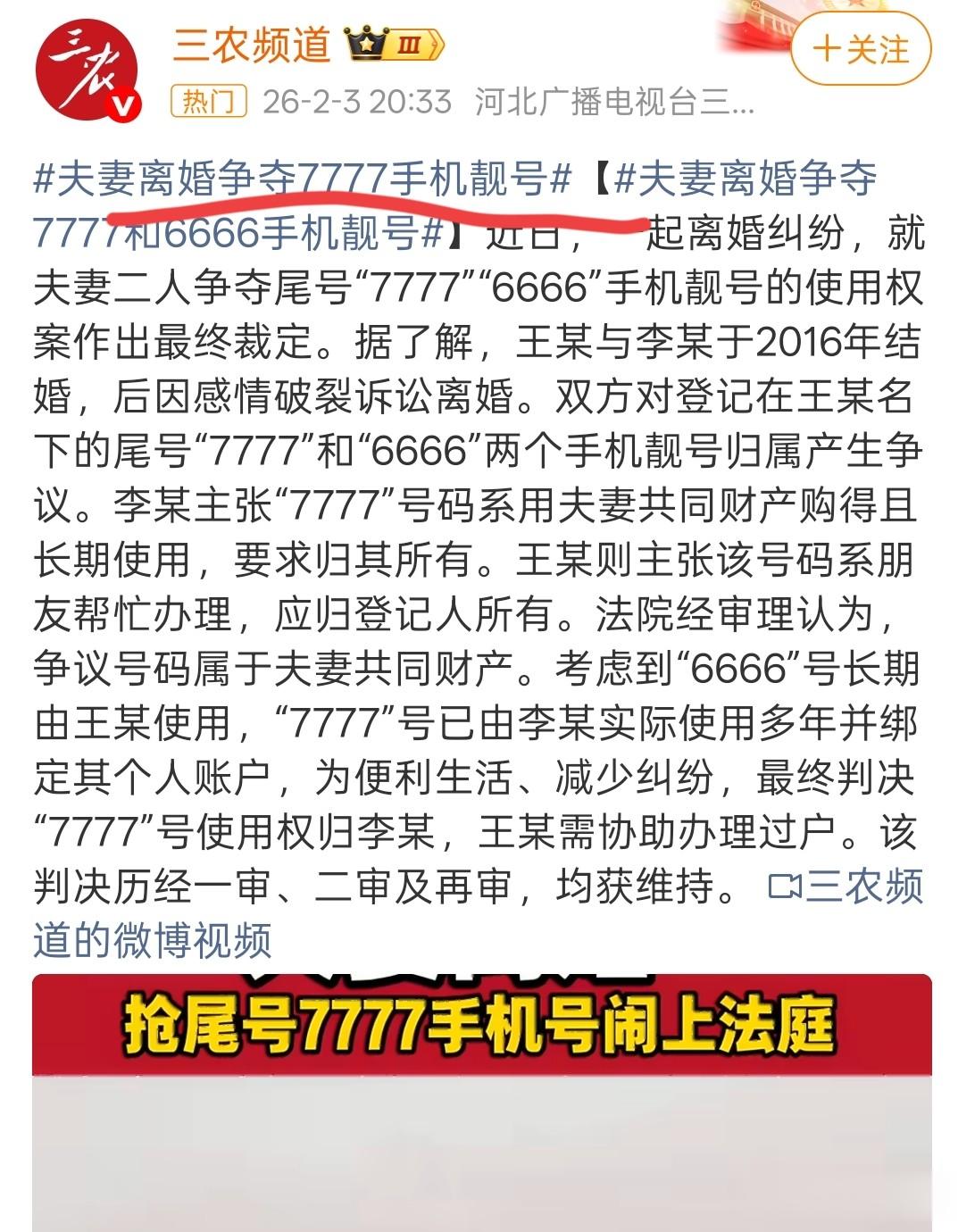 媒体报道夫妻离婚抢尾号7777手机号闹上法庭新闻截图