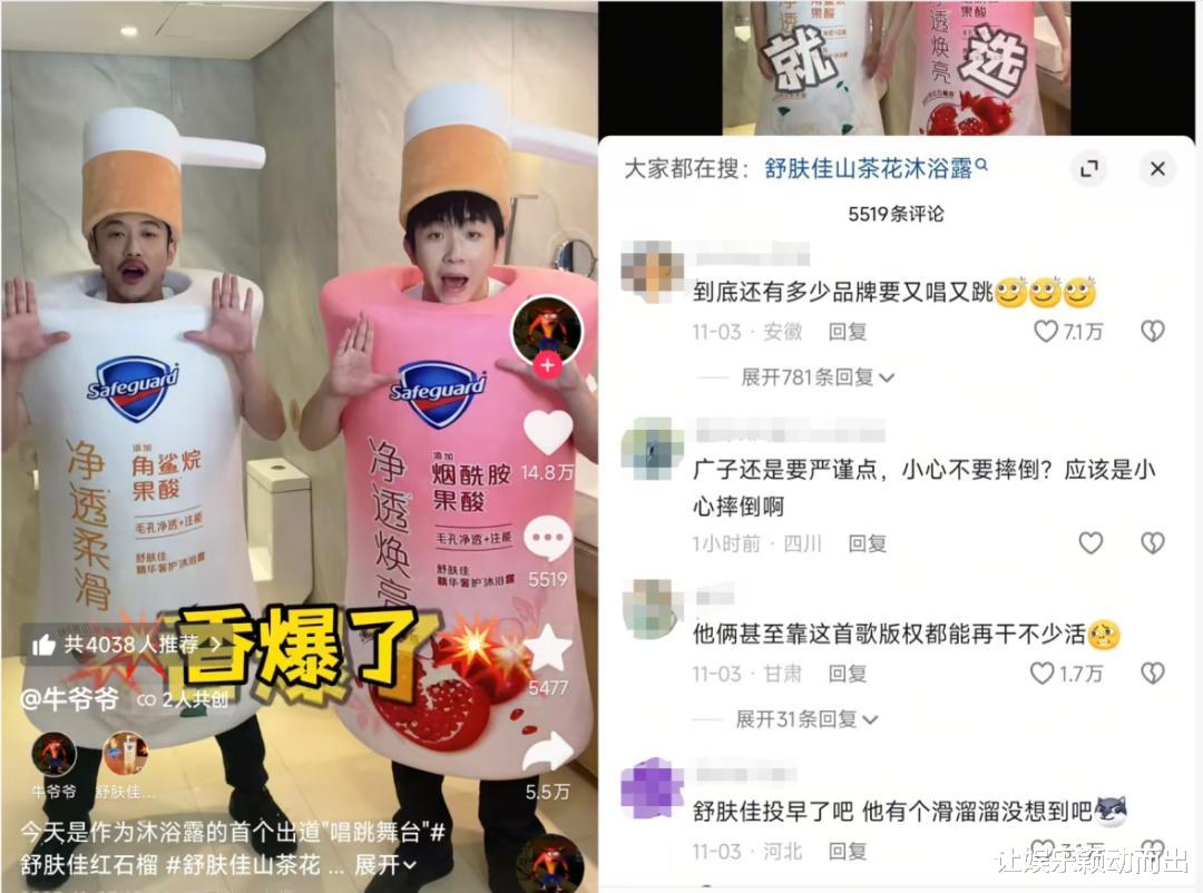 这几则广告创意,同质化采用了《技能五子棋之歌》的唱跳元素,只是单纯在广告词上做了替换式创新,本质上与品牌产品的关联度不足,比如舒肤佳的广告片中就只是简单将品牌卖点尬唱了出来,用户无法直观看到“技能沐浴露”嫩滑、不拔干等功效,且此类型广告看多了很难不产生疲劳感,有网友发出了调侃式质疑,“到底还有多少品牌要又唱又跳”。