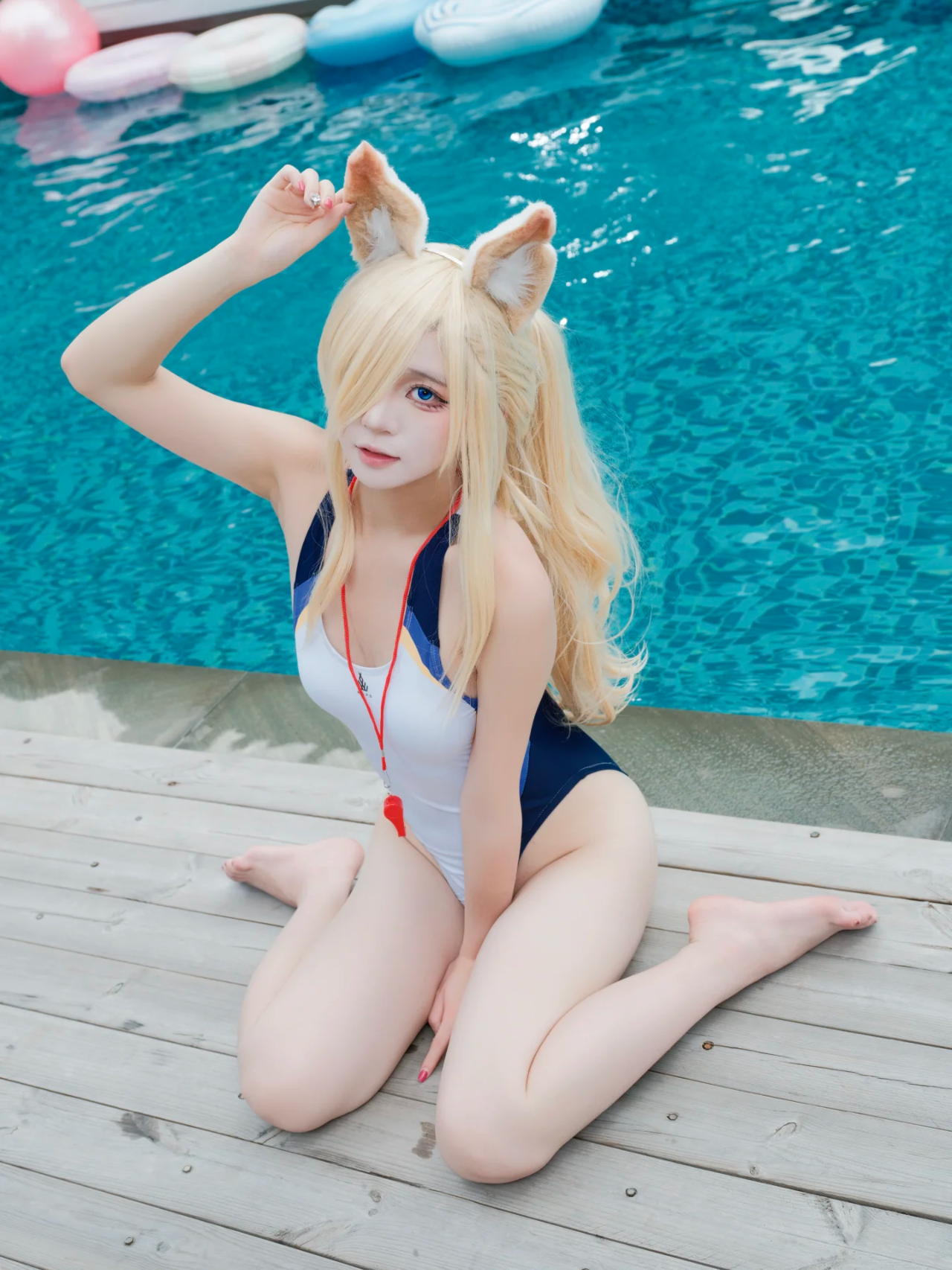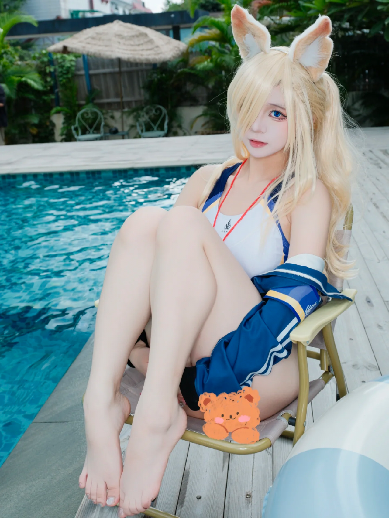 coser(这里有点可惜,没找到coser是谁)对尾刃康娜的cos在细节上是十分用心的。金色长卷发假发蓬松自然,不仔细看完全看不出是假发的,以及发丝的卷曲度完美还原角色的发型。兔耳的装饰造型柔软又逼真,色泽和质感显得非常精致,瞬间就让这么一位“兽耳少女”的形象立起来了。从服饰方面来看,蓝白配色的泳装与外套搭配,只能说是绝绝子了!还有身上的红色挂绳哨子等小配饰,把青春活力拉满了。