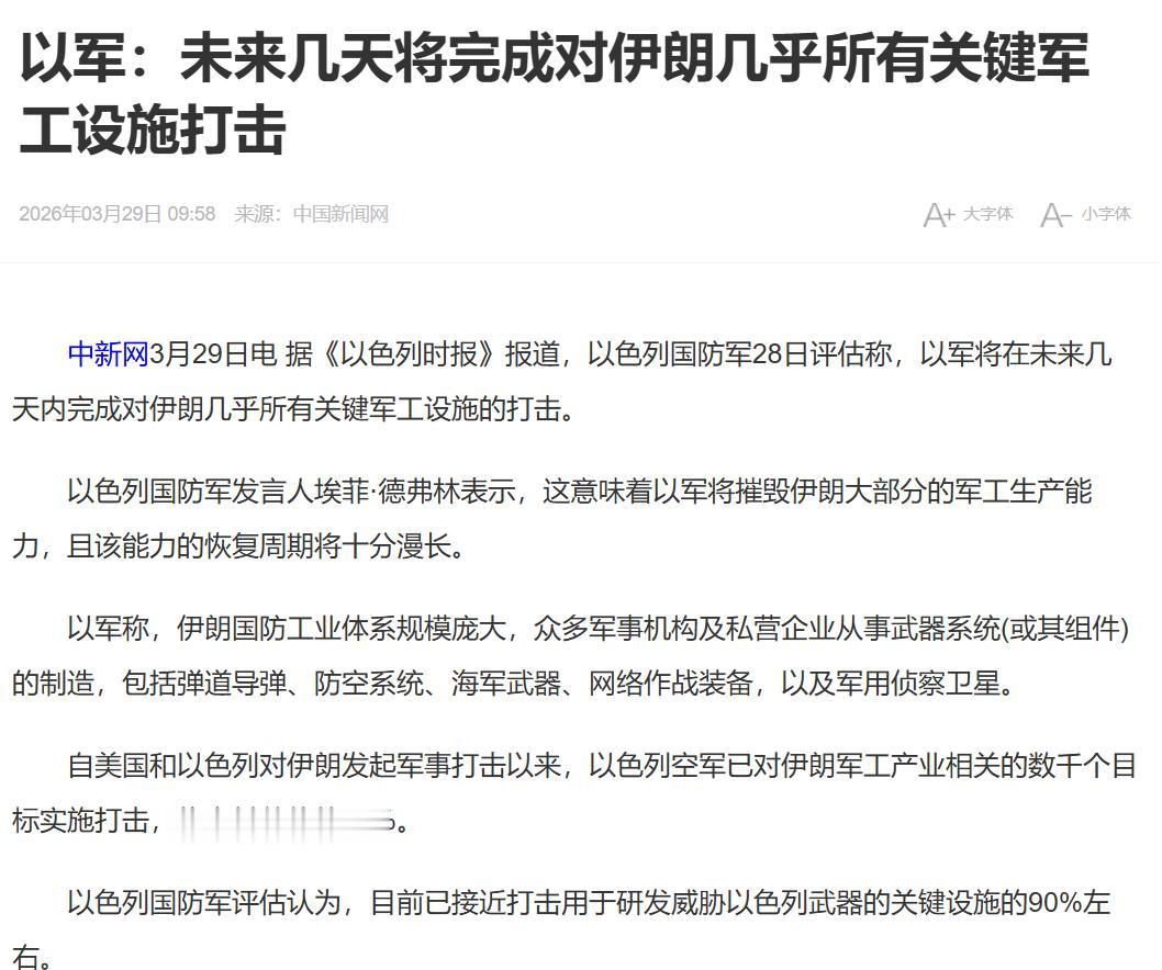 以军:未来几天将完成对伊朗几乎所有关键军工设施打击