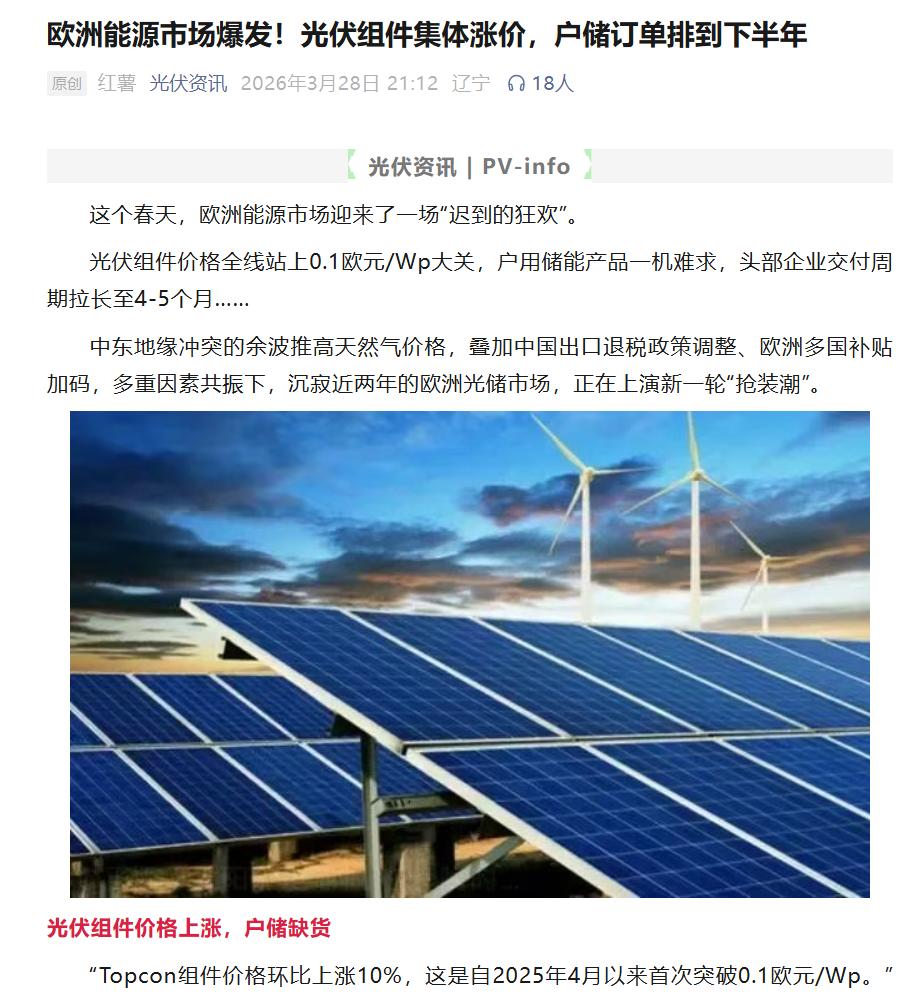 欧洲能源市场爆发!光伏组件集体涨价,户储订单排到下半年