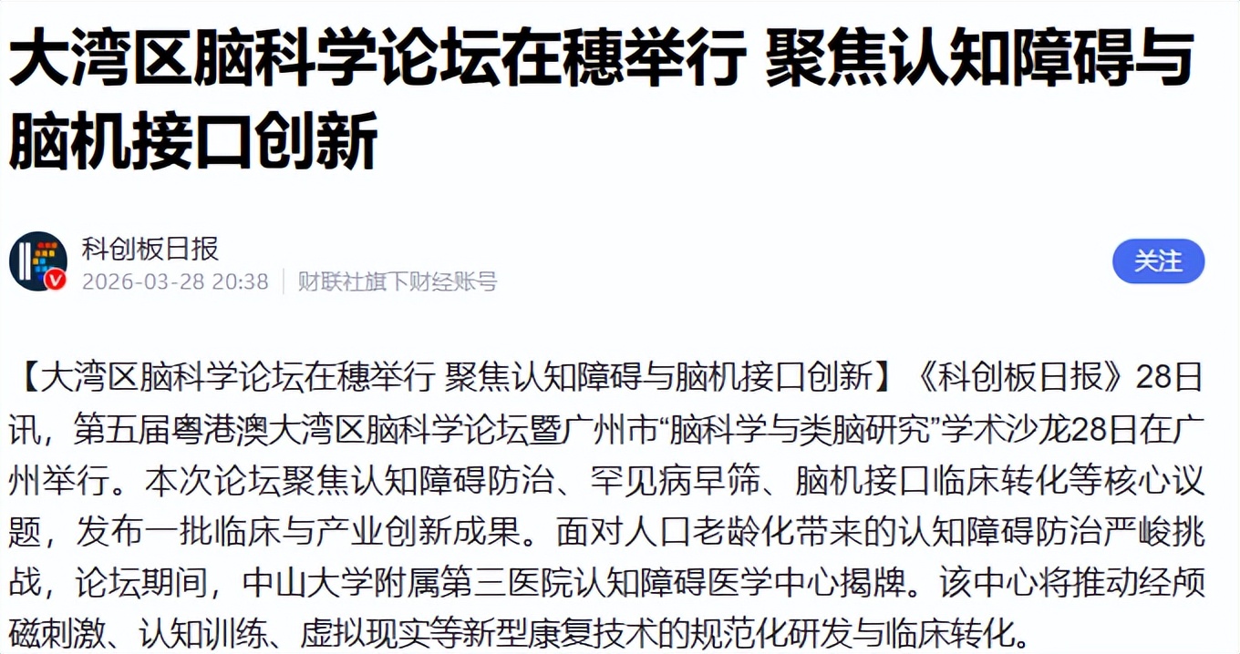 大湾区脑科学论坛在穗举行 聚焦认知障碍与脑机接口创新