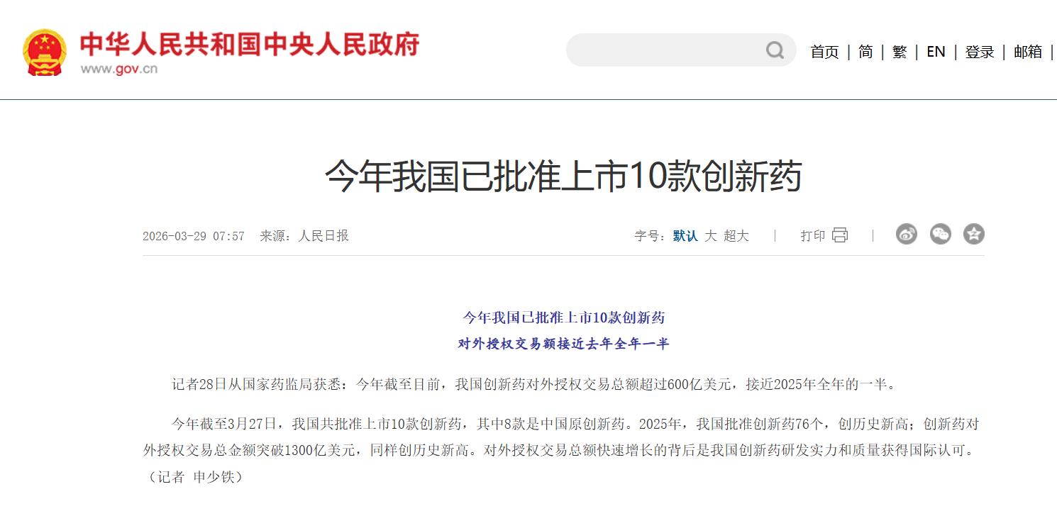 今年我国已批准上市10款创新药 对外授权交易额接近去年全年一半