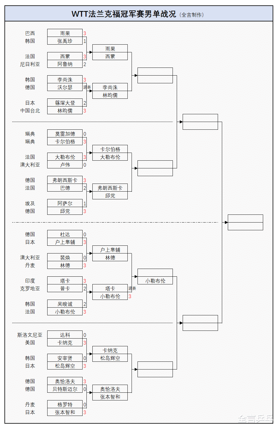 值得一提的是,印度选手塔卡已经因伤退赛,这就使得法国主力小勒布伦不战而胜率先晋级8强——男单比赛的最新进展如下: