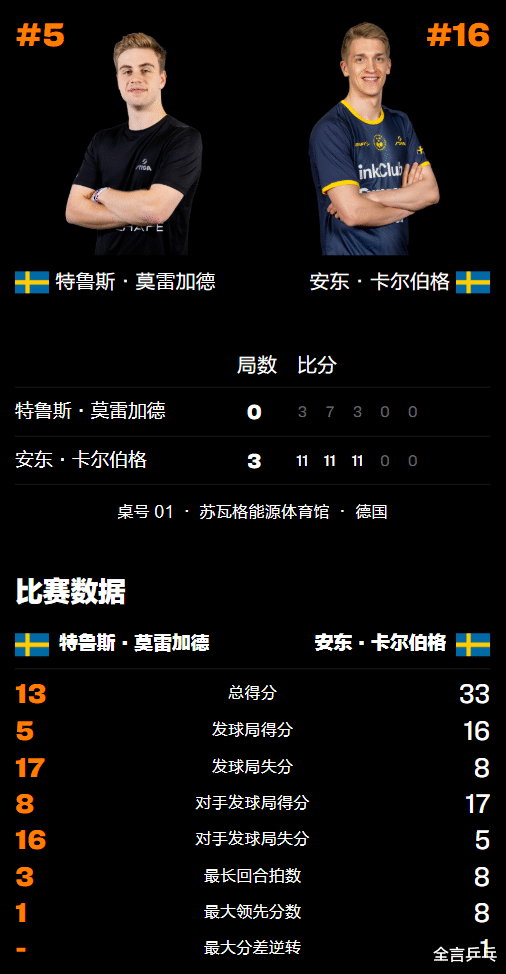 比赛开始后,卡尔伯格率先发动连得2分,莫雷加德随后追赶在1-4的位置等到了队友发球直接失误丢分,但很快继续被压制2-9被拉开差距,紧接着3-10出现局点,最终以3-11惨败先丢一城,完全被卡尔伯格束缚手脚。