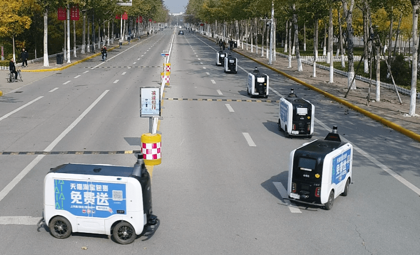 图片来源:北方网|9辆菜鸟无人车在天津师范大学执行送货到楼任务