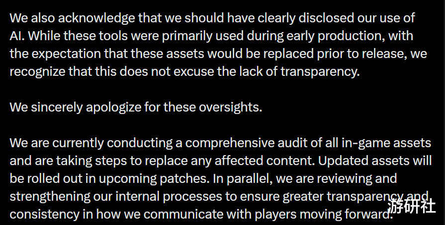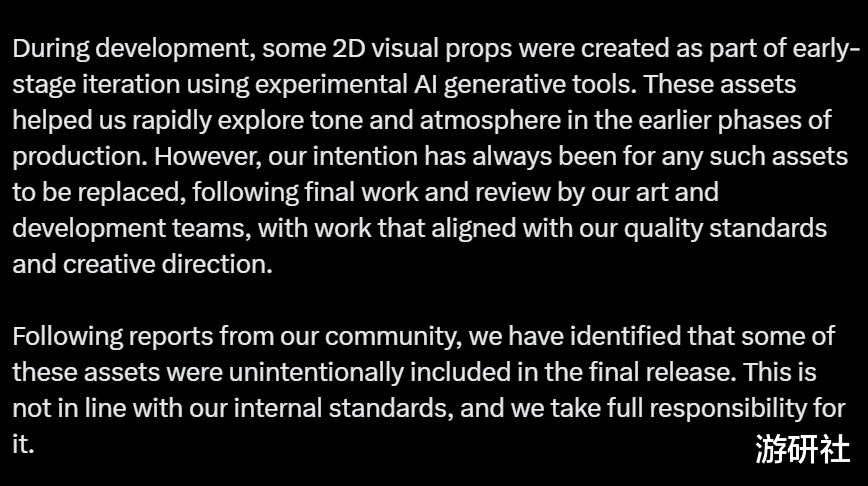 不过,昨天《红色沙漠》官方还是在推特发布了一篇长文,回应了关于使用AI生成素材的争议。官方表示,这些AI美术之所以出现在正式版中,属于流程上的失误。