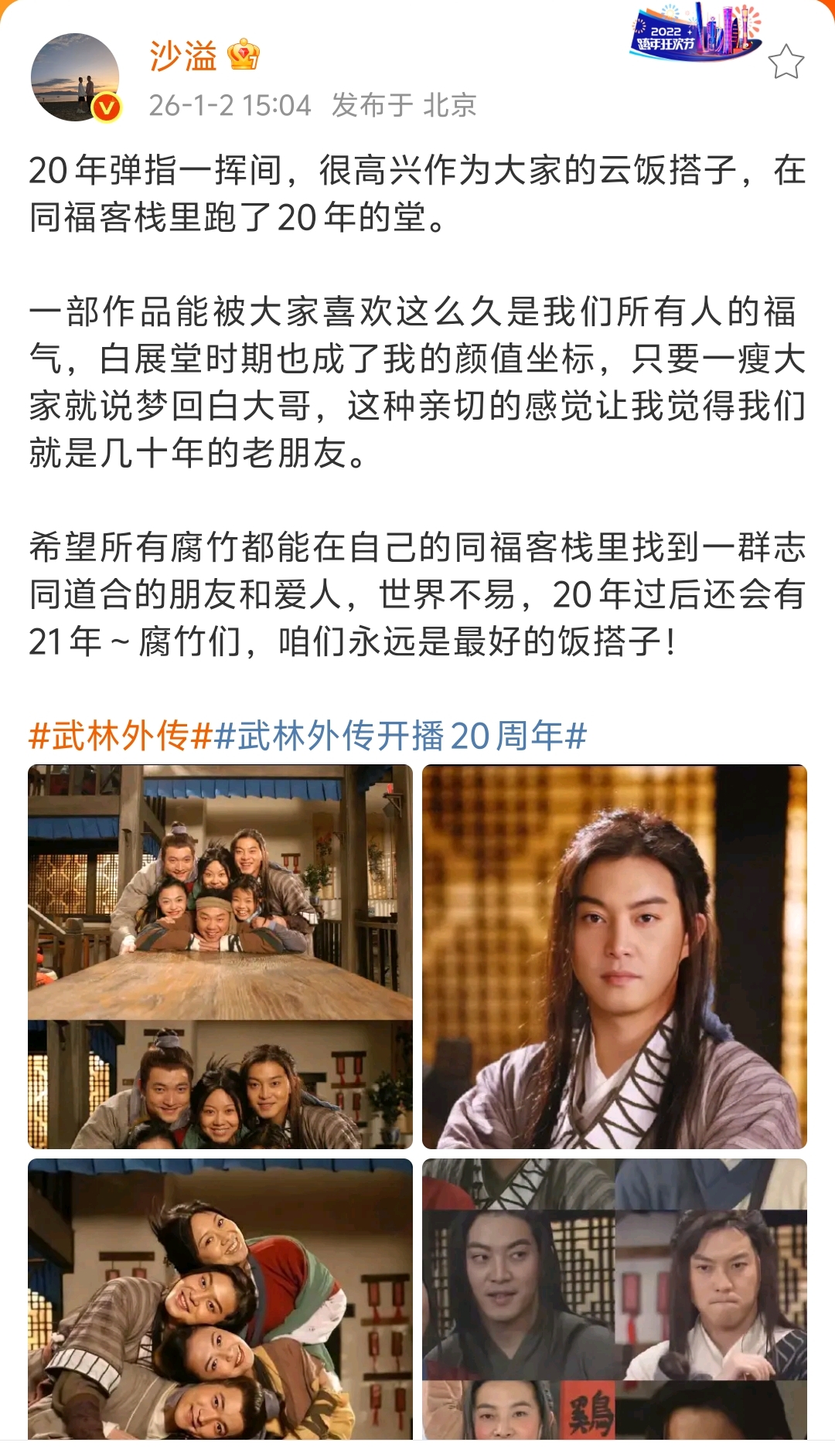 沙溢也为20周年发了一段感想,在同福客栈跑了20年的堂,原来20年真的弹指一挥间。