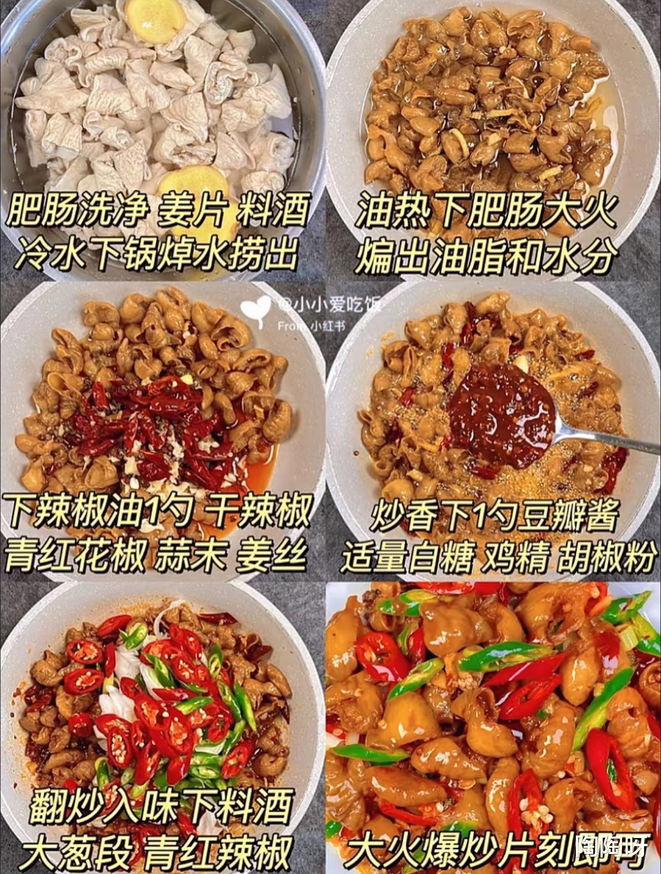 -热锅凉油,倒入肥肠,大火快速翻炒,编出油脂和水分,肥肠表面微微焦黄即可。