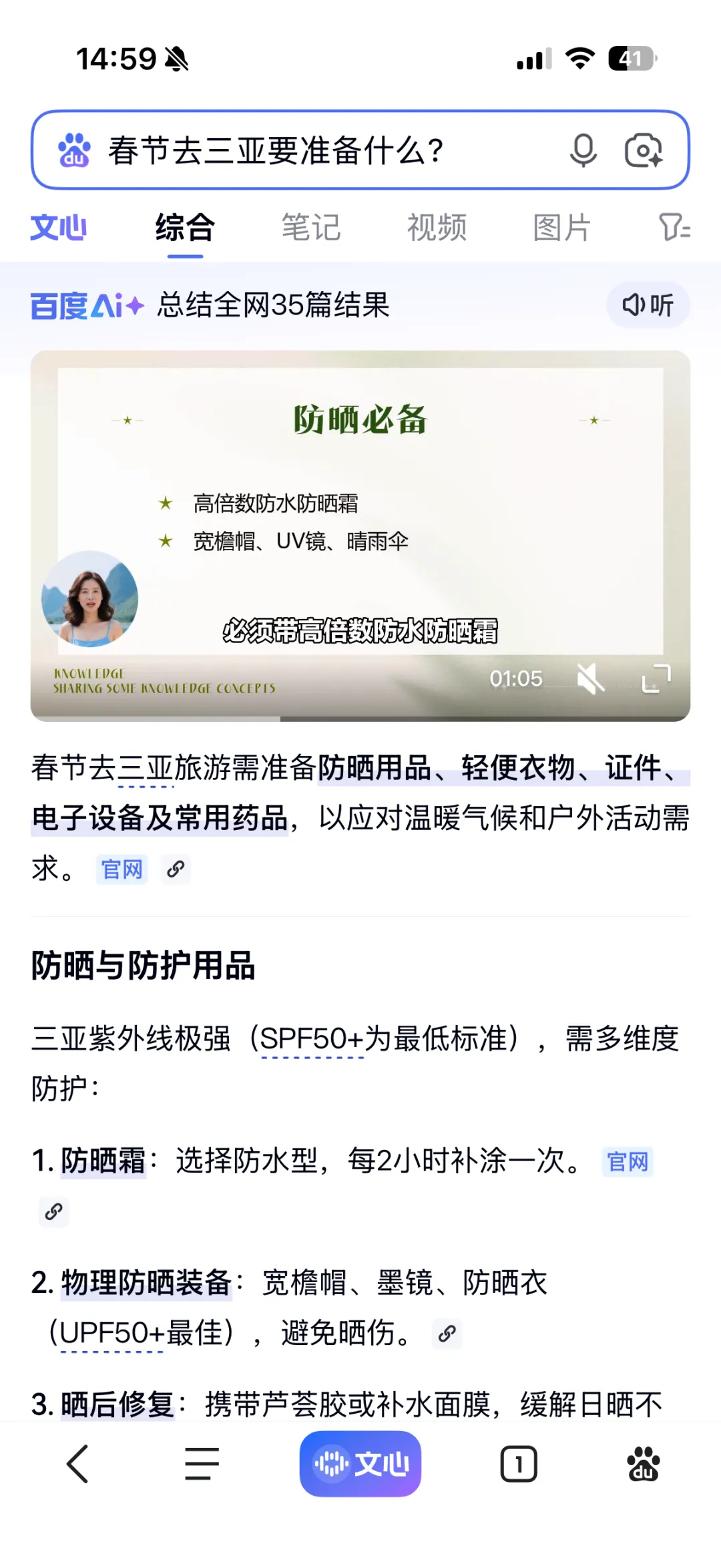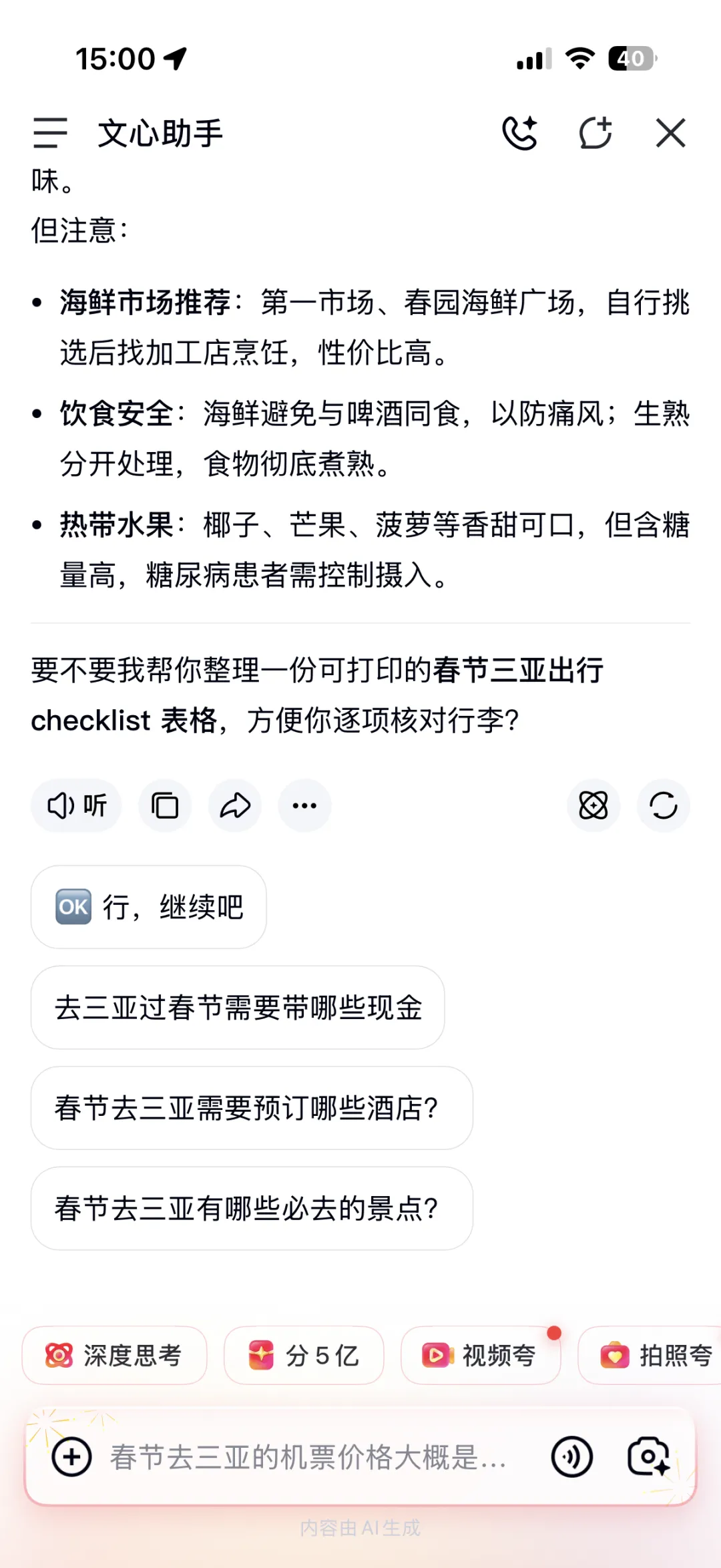 现在你在百度 App 内提问,比如“春节去三亚要准备什么”,顶部直接就呈现百度 AI 助手生成的富媒体答案,点击可在文心内继续追问行程细则、酒店推荐。