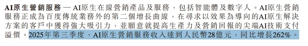 去年第三季度,百度首度披露 AI 业务收入,其中包括智能体、数字人等在内的 AI 原生营销服务收入达 28 亿元,同比大涨 262%,占到百度核心在线营销营收的 18%。