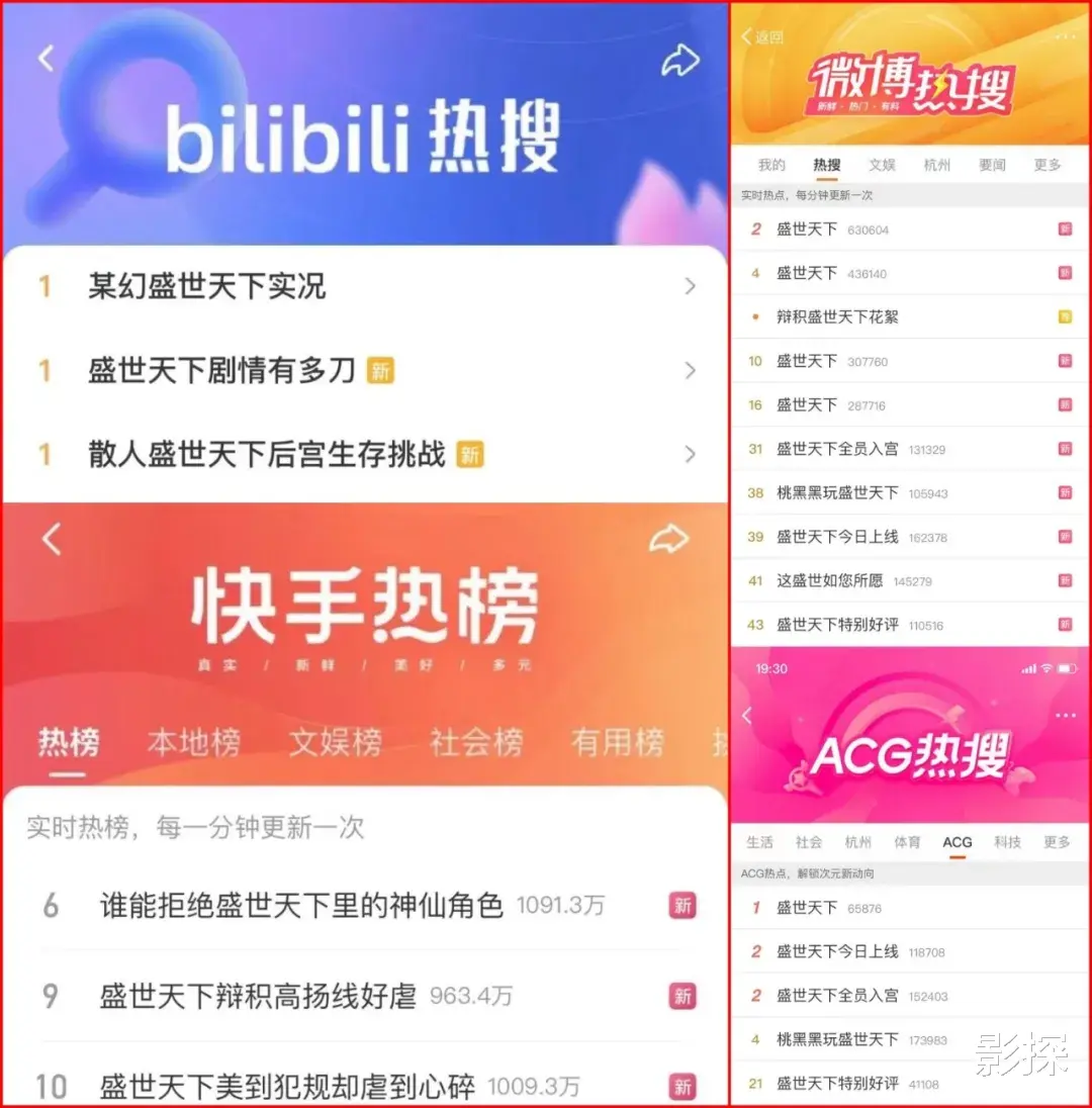 做主角,你能活几集?《盛世天下》不仅热梗出圈,引发网友层出不穷的讨论,更承包了各大平台的热搜榜。从全平台100+热搜,话题量已超10亿来看,《盛世天下》在社交媒体平台非常火爆。可以说,我们已经被《盛世天下》包围了。