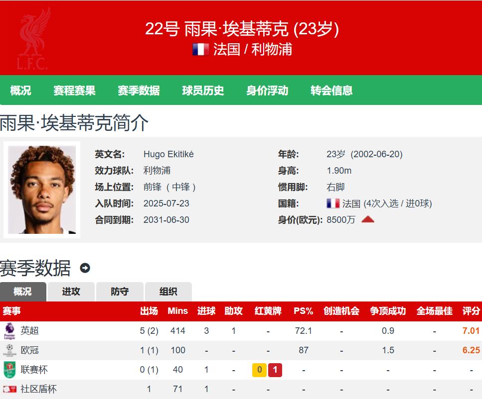 埃基蒂克现年23岁,右脚中锋,身高1.90米,高挑不失灵活,具备很强的速度和脚下速度,利物浦遭遇4连败之前,埃基蒂克7场5球1助独造6球。随着伊萨克到来,状态火爆的埃基蒂克因为位置原因就失去了主力位置,加上萨拉赫状态低迷+踢球很独不传球导致利物浦进攻端一团糟。