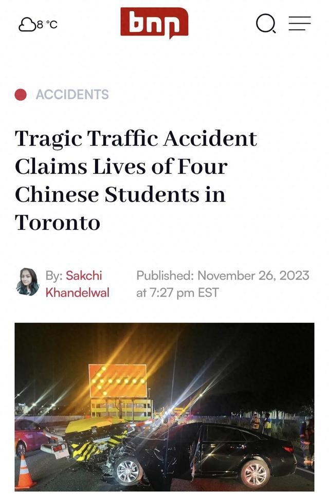 4名中国留学生遭遇车祸身亡,驻多伦多总领馆已启动应急机制处理。