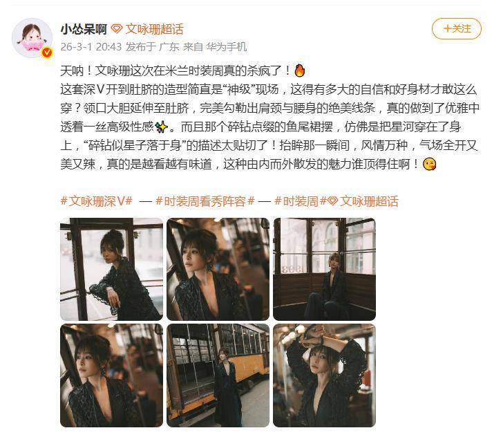文咏珊在米兰时装周的一记“深V暴击”,直接让全网不淡定了。一袭领口开到肚脐的黑色礼服,搭配看似乖巧的减龄刘海,不仅瞬间引爆话题,更被网友封为“妹感姐”天花板——少女的灵动与女王的霸气,在她身上来了个完美对撞。