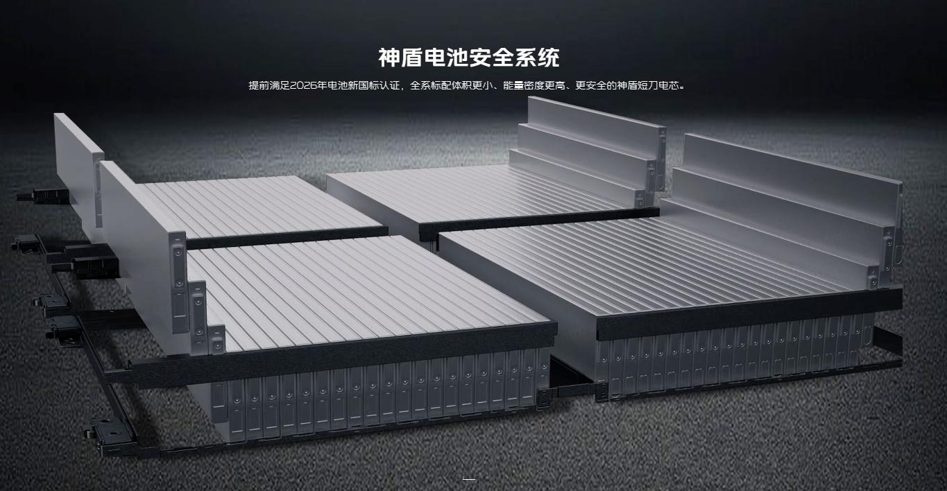 安全层面,新车全系标配神盾电池安全系统与短刀电芯,电池安全通过100+项测试(含30+项严苛极限测试),包括24h水泡不漏、2m跌落不炸、高温火烧不着(超国标1.5倍)等,提前满足2026年电池新国标。短刀电芯能量密度达173Wh/kg,八针同刺不起火,电池包上盖板结构耐压能力达行业标准3倍,防爆泄压速度为行业平均水平2倍。