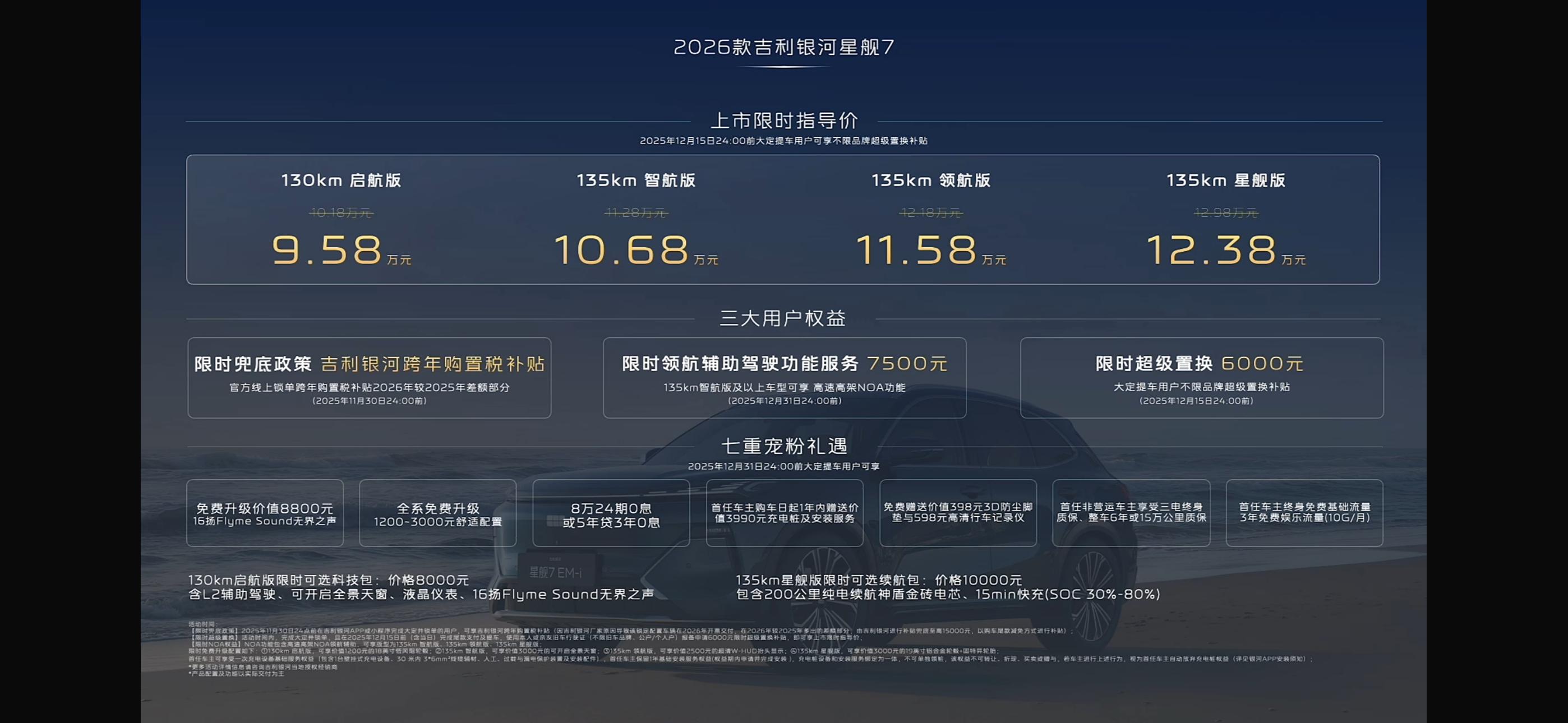 11月19日,吉利汽车旗下重磅电混SUV——2026款银河星舰7 EM-i正式迎来上市。以“五新标杆”“十大越级满配”重新定义家用SUV标准。官方限时指导价为9.58万元起,为主流新晋小家庭带来“更省心、更安心、更舒心”的出行体验。