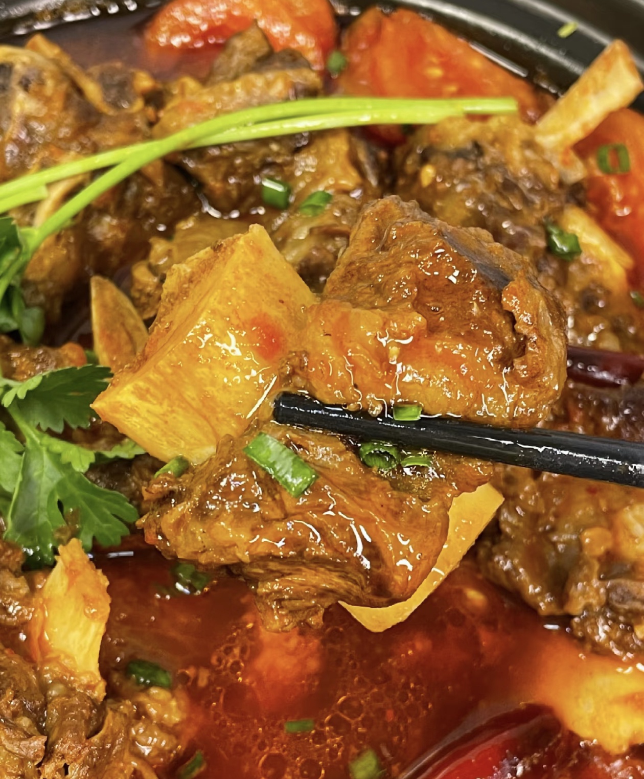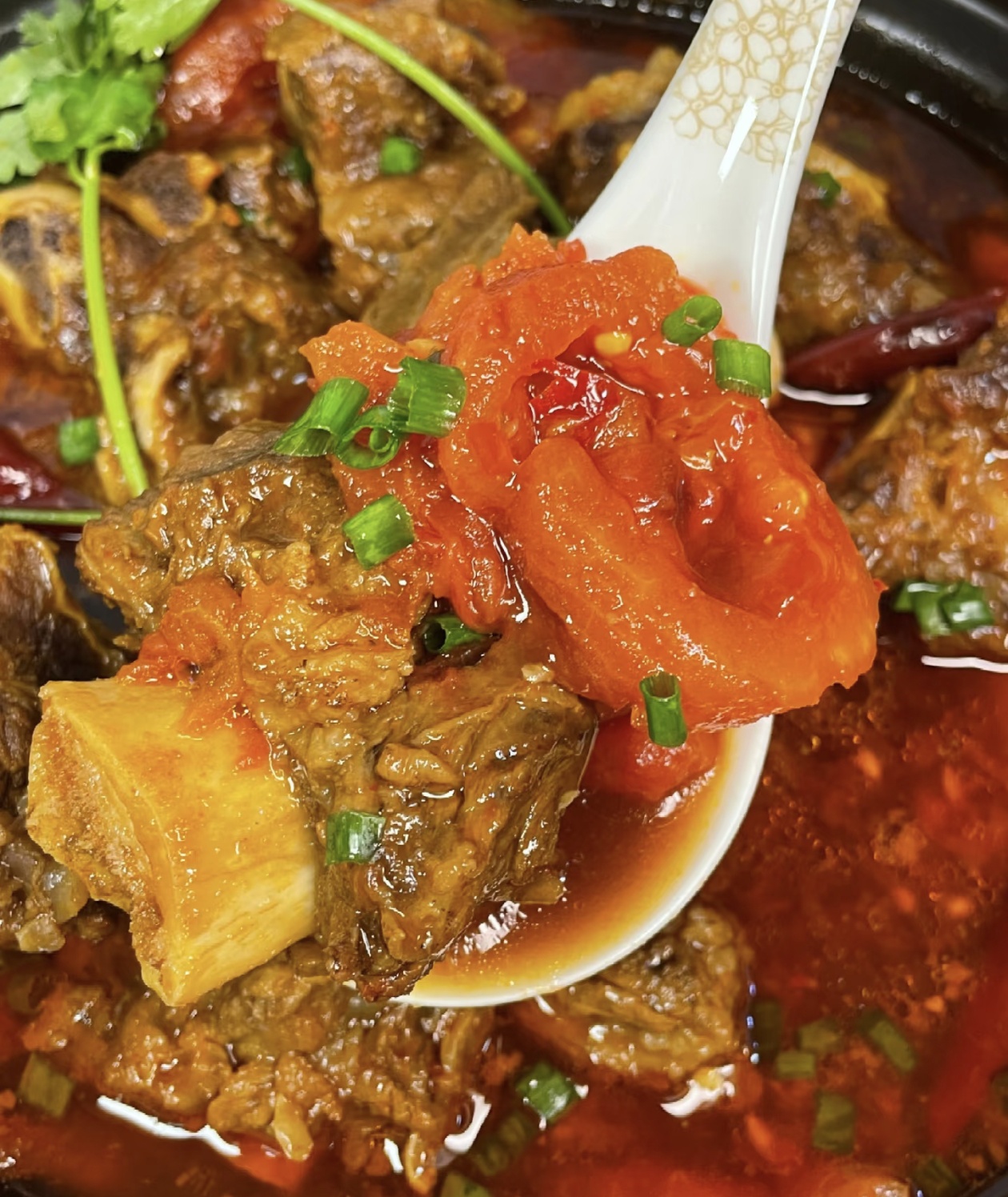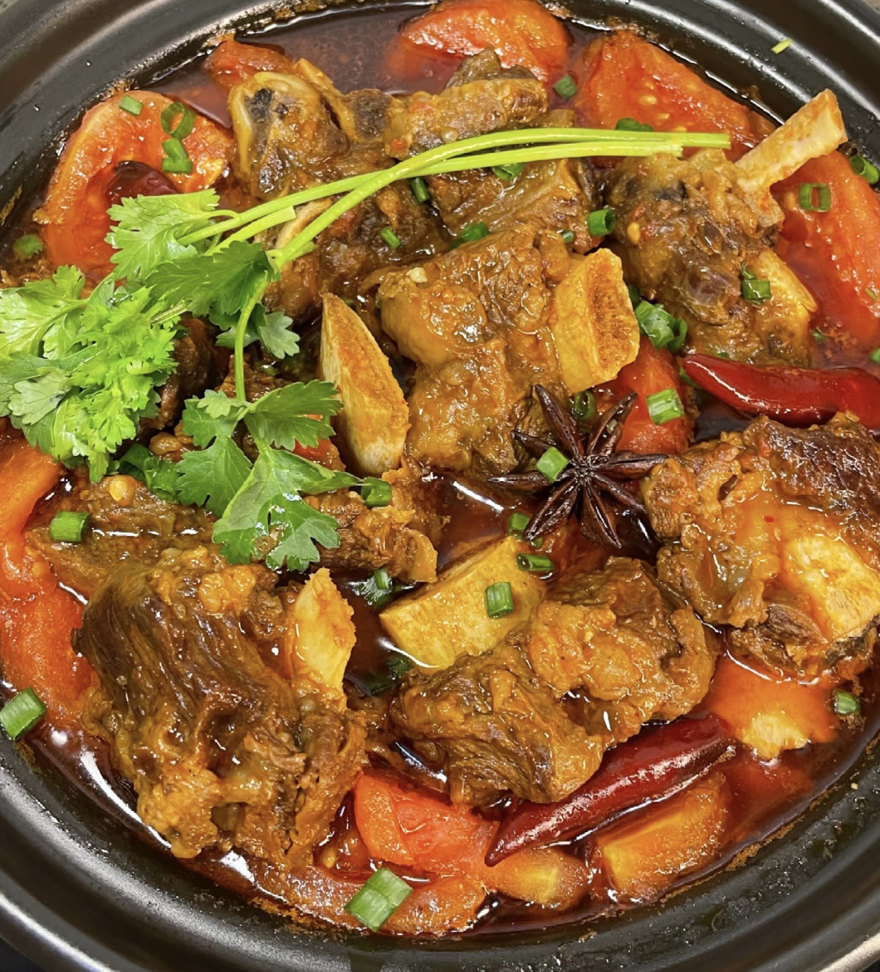 等排骨炖到用筷子能轻松扎透的时候,打开锅盖,把剩下的一半番茄块倒进砂锅里,转大火煮开后,再转小火煮十五分钟。这一步很关键,后放的番茄能保留完整的口感,煮软后会变成沙沙的状态,让汤汁的番茄味更浓郁,还能吃到带着颗粒感的番茄果肉。出锅前撒上一把切碎的香菜和小葱花,红亮的汤汁里飘着翠绿的香菜,瞬间就有了家常烟火气。