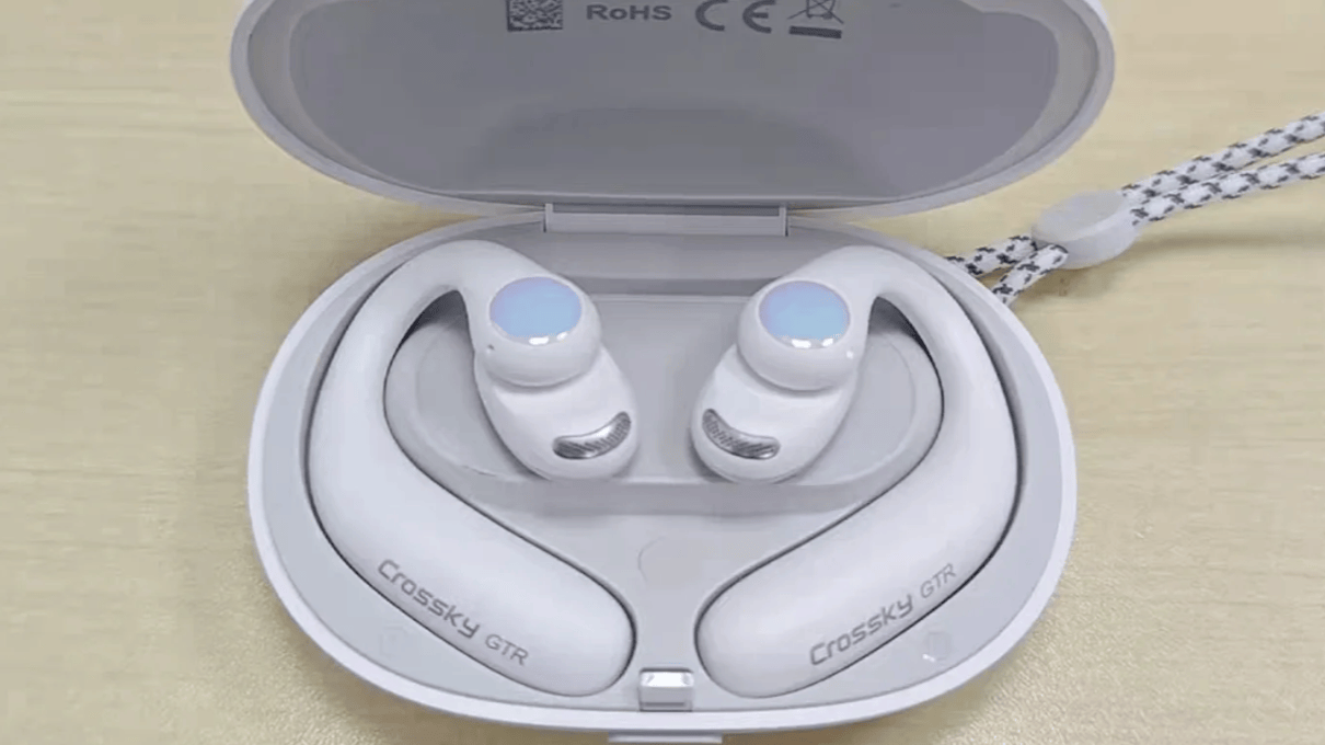 QCY Crossky GTR这款开放式耳机,外观设计挺有特色的,表面是哑光磨砂质感,手感细腻不留指纹。单耳重量约12.3克,在开放式耳机里算是偏重一些的。