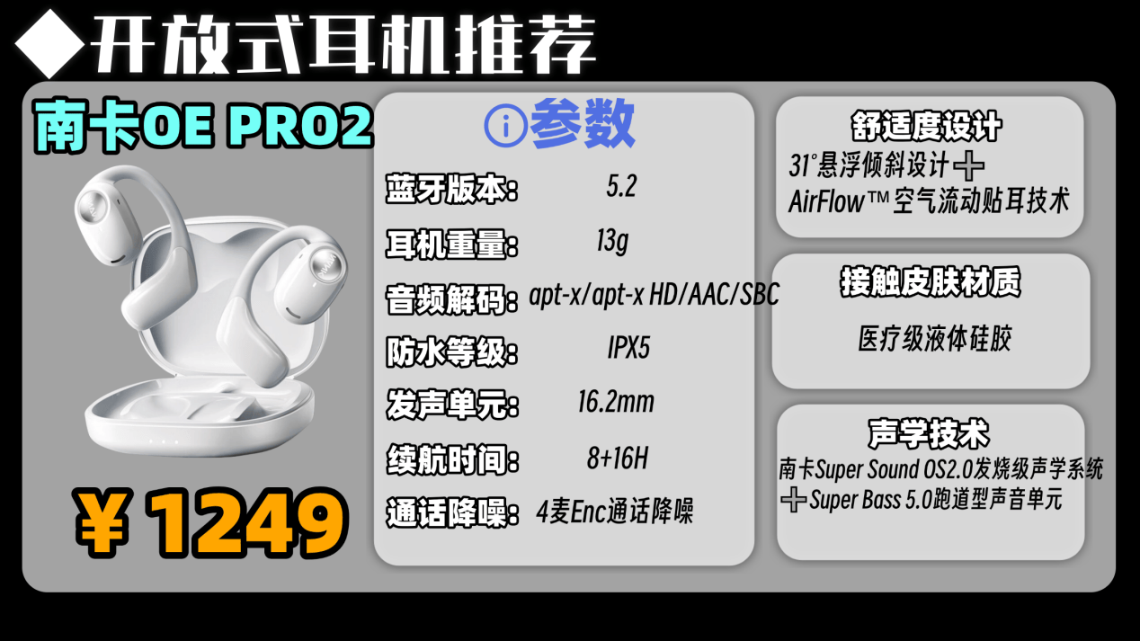 南卡OE Pro2自发布以来,口碑与热度持续走高,成为开放式耳机领域的爆款。其核心优势在于始终坚持“软硬件结合”理念,在南卡13年声学技术积淀的支撑下,实现了开放式耳机长期存在的音质单薄、漏音严重等行业痛点的突破。还整合了全能Ai智慧助手,覆盖翻译、对话、搜索、写作、创作等多场景应用。可以说是南卡开放式耳机目前是旗舰满配巅峰。它被公认是业内专业度最高的牌子,获得了hifi发烧友和消费者的广泛认可和支持,即使不推广宣传,在各中高端品牌中也享有超高的口碑和销量!