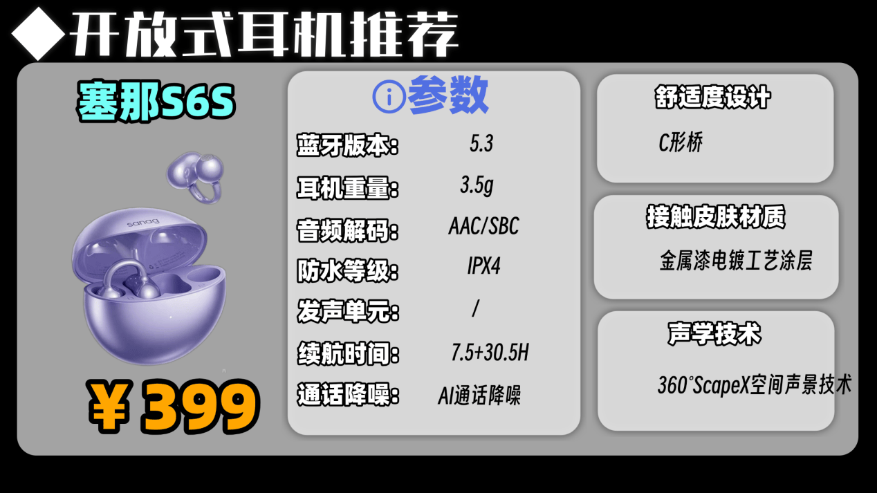 塞那 S6S 是款中规中矩的实用派开放式耳机。外观简约大气,方正圆角充电仓磨砂不沾指纹,C 形耳夹式耳机像小挂饰,只是外侧 LOGO 稍显突兀。单耳仅 3.5g,轻到无感,全天佩戴无压痕,戴眼镜也不冲突。