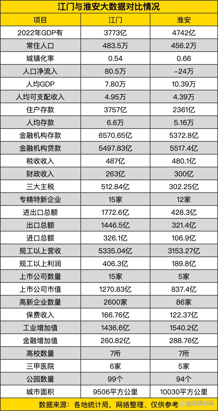 先看淮安。这位选手在“总量”和“人均”指标上占优。GDP总量超过4700亿,人均GDP达到10.39万元,均显著高于江门。城镇化率也更高(66%),显示出城市聚集发展的水平。财政收入、工业增加值、金融业增加值等反映“官方”和“大项目”经济实力的指标,淮安也普遍领先。这表明淮安可能拥有更强的国企、大型制造业或基础设施投资拉动,经济发展的“集中度”和“大块头”特征更明显。但值得注意的是,淮安的人口是净流出的(-24万),这可能与其产业结构、就业机会对本地及外来人口的吸引力有关。