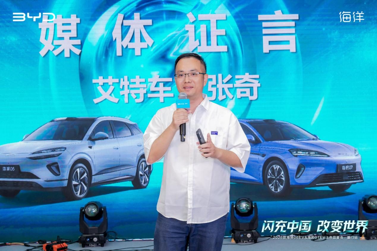 车型讲解之后,厦门艾特车张奇老师从行业观察者和亲身体验者的角度,分享了对第二代刀片电池和闪充技术革新的深刻见解。“海狮06EV的闪充速度和云辇-C的舒适表现给我留下了深刻印象。”他表示:“比亚迪真正将补能效率提升到了新的维度,让‘充电比加油更快’从愿景走进了现实。”