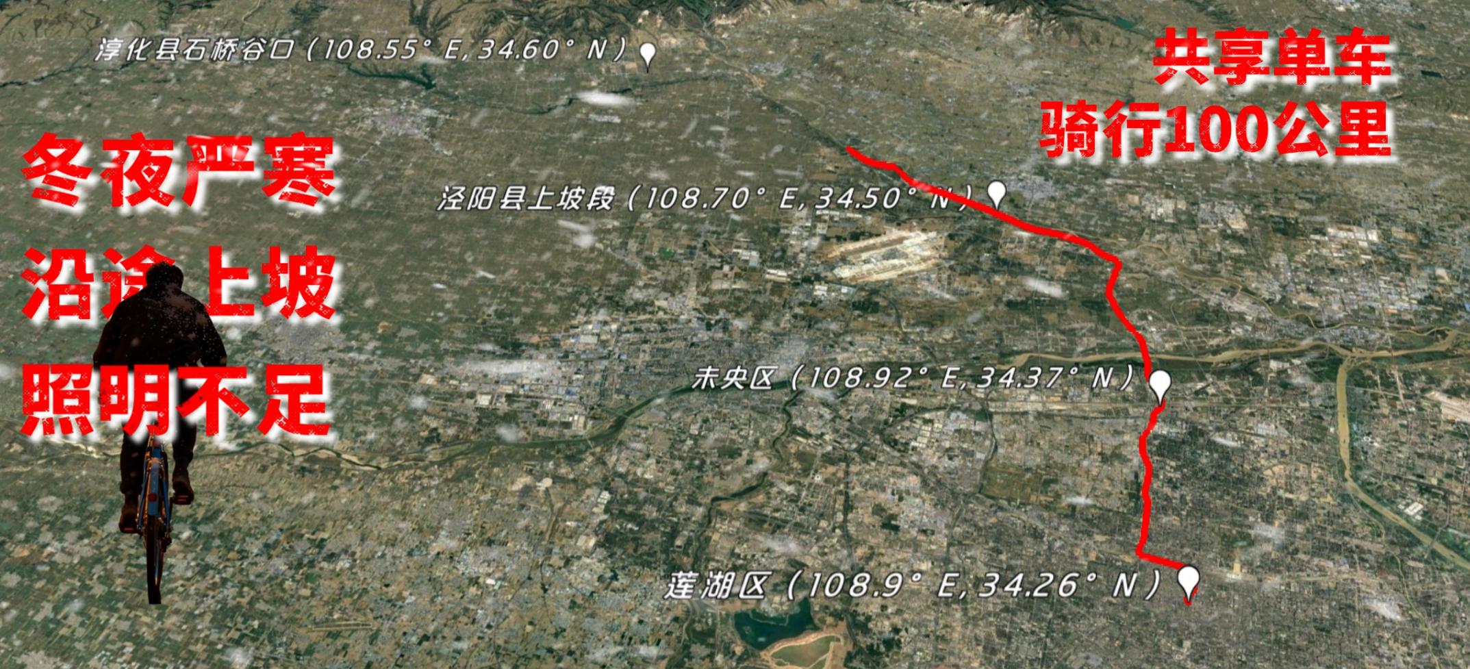 古有关公千里走单骑,今有硬汉夜骑车百里,这哥们儿在12月22日,冬至第二天,本该和家人窝一起热腾腾地继续吃饺子,但他却在晚上8:00左右,从莲湖区(108.9400°E, 34.2600°N)扫了一辆共享单车,没带手套没穿厚外套,一路冲到未央区(108.9200°E, 34.3700°N)。