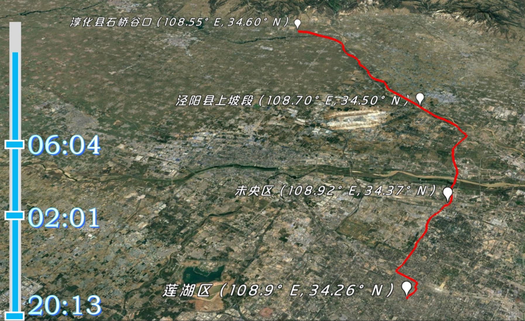 16 日:从咸阳机场(108.7500°E, 34.4400°N)出发,向南穿过市区,徒步过渭河(108.7000°E, 34.4000°N,),没带冰爪差点滑倒,鞋全湿了;