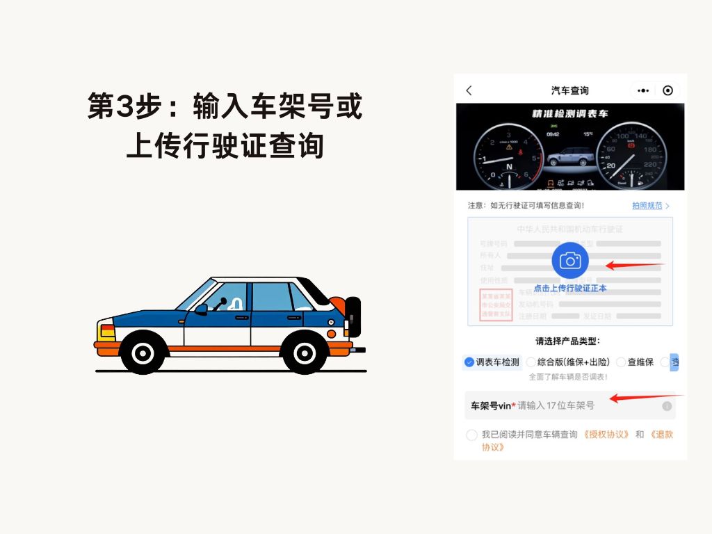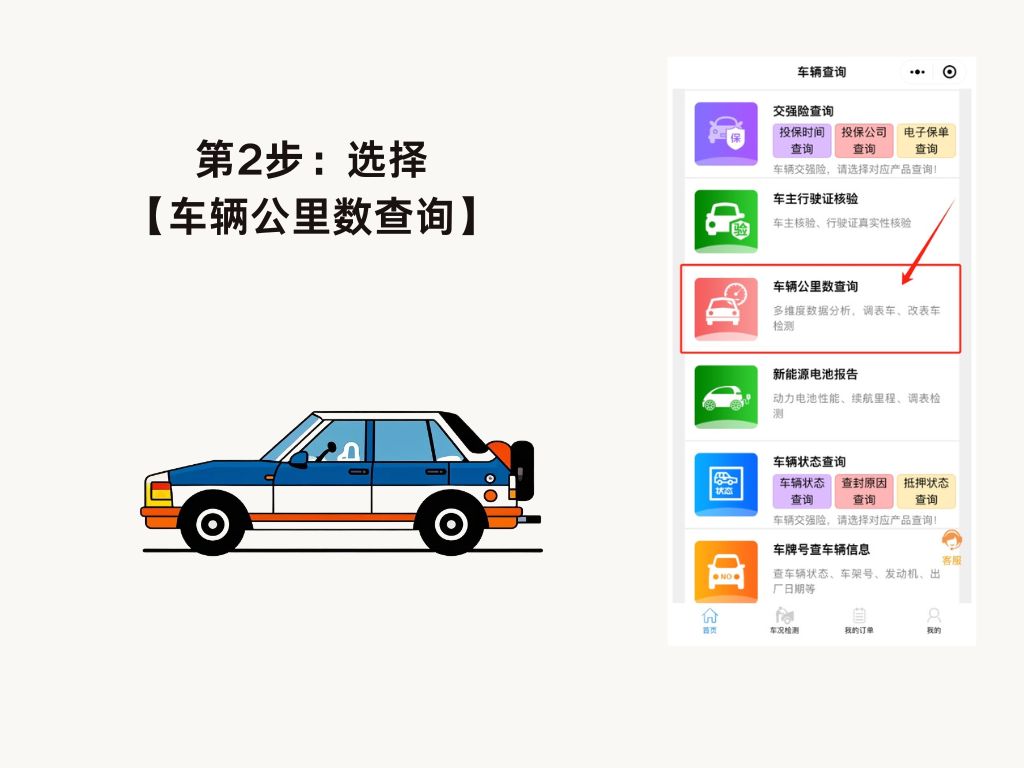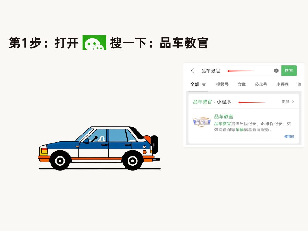 打开微-信,在上面的搜索框,输入:品车教官,进入后,找到:【车辆公里数查询】或【里程记录查询】,输入车架号或行驶证信息进行查询。