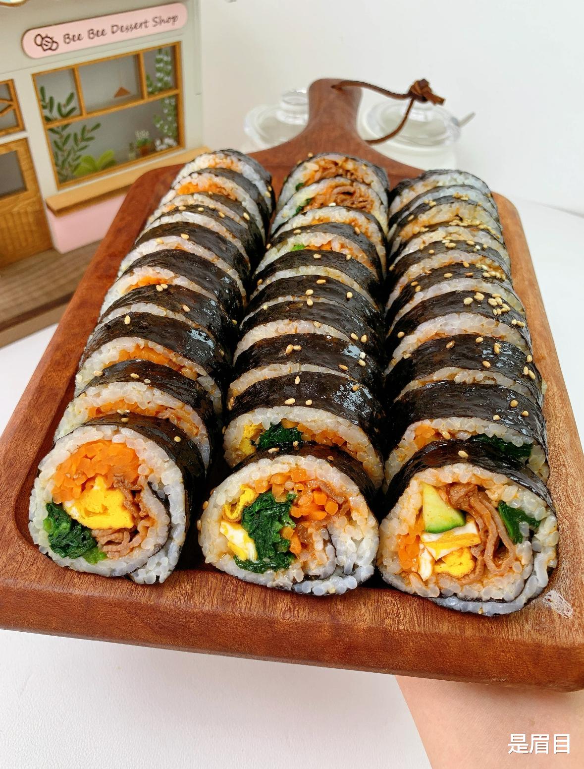 主食:米饭(短粒米或珍珠米为佳)约2杯(400克),专用烤紫菜几张。蛋白质:牛肉(牛肉片或牛肉末)200克,鸡蛋1-2个。蔬菜:胡萝卜小半根,黄瓜(或西葫芦)小半根,菠菜少许。调味料:芝麻油、盐、酱油、白糖、蒜末、韩式辣酱(或蒜蓉辣椒酱)等。1.米饭是紫菜包饭的基础。建议选用短粒米,煮好的米饭趁热加入芝麻油和少许盐(可根据口味加少量糖平衡咸味)搅拌均匀。米饭需要保持温热,这样更容易调味和铺开。2. 将牛肉切丝或切片,加入切碎的泡菜和韩式辣酱(根据个人口味调整用量)腌制至少1小时,然后下锅炒熟。牛肉可提前用酱油、白糖、蒜末等腌制后炒香。鸡蛋加少许盐打散,在锅中摊成薄蛋饼,冷却后切丝。胡萝卜切丝后可略微翻炒或焯水至软。黄瓜切条后可用盐腌制片刻使其稍软并沥干水分。其他配菜准备好少许波菜加盐焯水处理。3.在竹帘上放一张紫菜(粗糙面朝上),均匀铺上一层薄薄的米饭,四周留出约1厘米的空隙。在靠近自己的一侧,依次铺上辣牛肉、鸡蛋丝、黄瓜条、胡萝卜丝和菠菜等配料。用拇指提起竹帘,将紫菜和配料卷起,第一圈要压紧。然后继续向前卷,每卷一下都轻轻按压确保紧实。卷好后用竹帘整个裹住饭卷,轻轻捏几下帮助定型。用一把锋利的刀,每切一刀前最好蘸一下清水或擦点香油,这样可以切得整齐不粘黏。建议切成2厘米左右厚的小段。米饭不宜煮得过软或过硬。温热时调味并铺开效果最好。黄瓜用盐腌一下去除多余水分,胡萝卜焯水或炒一下,可以防止卷好后出水影响口感和形状。铺米饭时四周一定要留边,卷的第一下要压紧实,这是防止散开的关键。你还可以尝试在铺好的米饭上再盖一张保鲜膜,然后整个翻面,让米饭朝外,做成反卷紫菜包饭,外层可以沾上芝麻或鱼籽,颜值更高。做好的辣牛肉紫菜包饭可以直接食用,也可以根据个人喜好搭配酱油芥末或韩式辣酱蘸食。最好当天食用完毕,因为放置时间长了紫菜会吸收水分变软。如果一次吃不完,可以用保鲜膜紧紧包好放入冰箱冷藏,建议在1天内吃完。