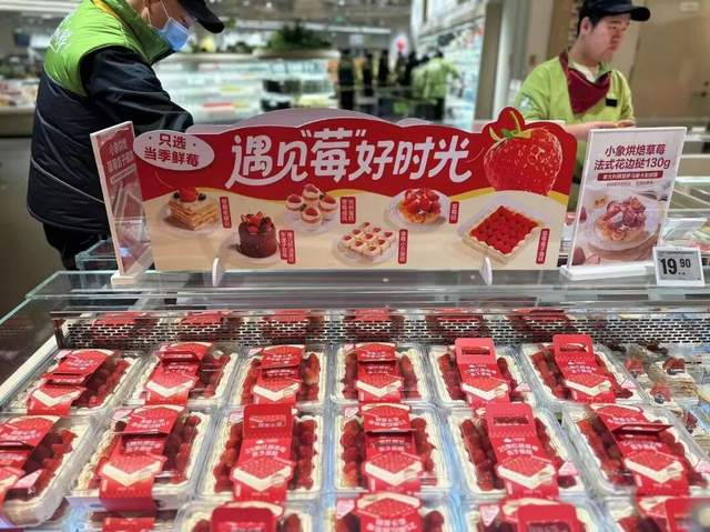 线下店,俨然小象超市自有品牌的“全品类体验场”,实现差异化和高毛利。一些网红产品价格在开业期间很有竞争力,小象烘焙750g草莓盒子蛋糕仅售49元,市面同规格其它品牌79元。