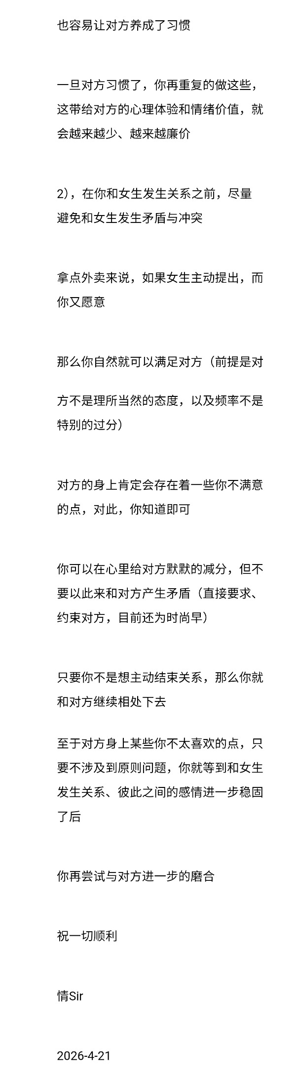 我之所以会这样子建议,因为你具体该如何与女生互动,看的是你和女生之间实际的、客观的、具体的互动状态(根据你和女生实时的互动状态,再来做相应的灵活性的调整),并不看你和女生相处时的表面行为,也不看你和女生在名义上是啥关系