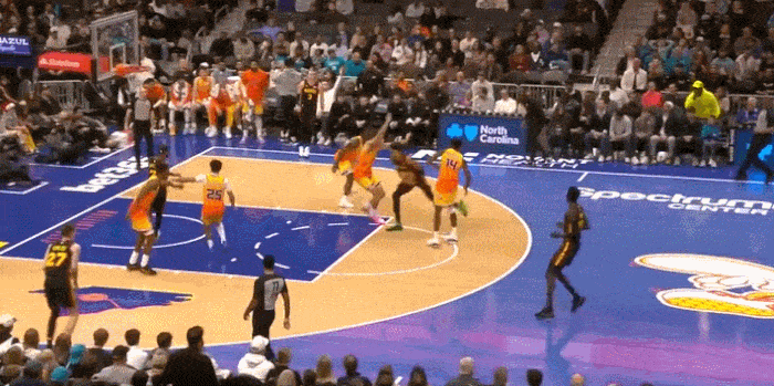 先是在外线突破两个人的关门防守,随后到内线面对两个人的封盖高抛命中