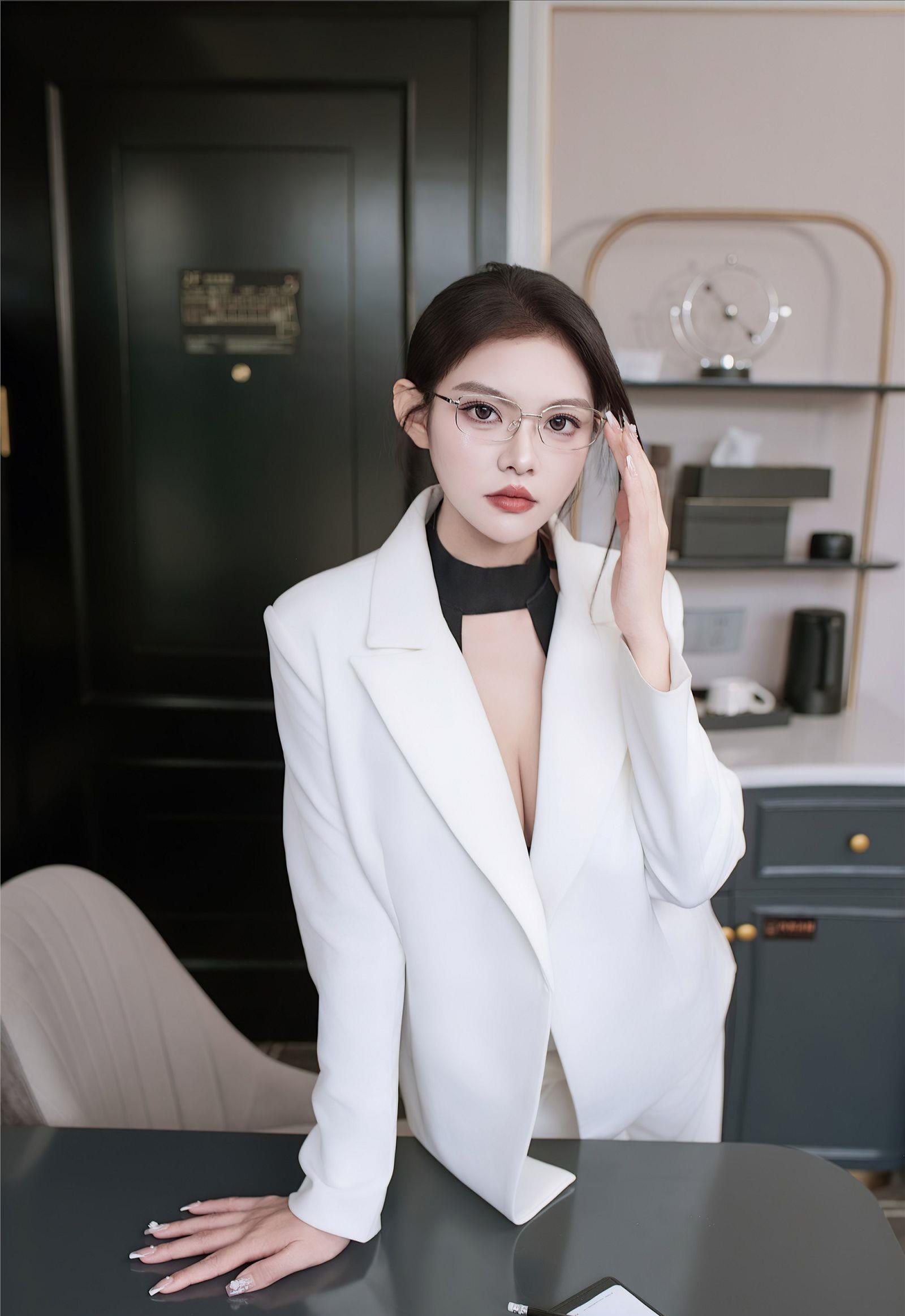 图中女性妆容精致,佩戴眼镜,身着白色西装与剪裁独特的黑色内搭,优雅倚靠桌边,单手托头。背景为冷色调室内空间,可见黑色房门